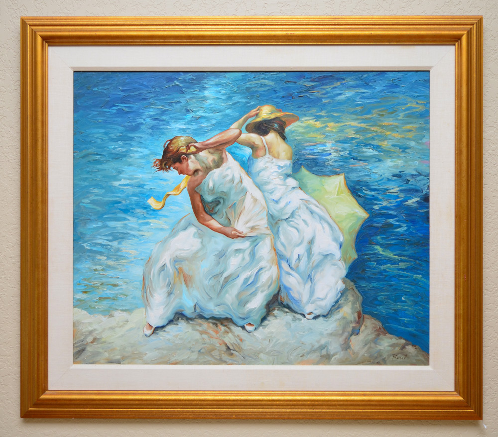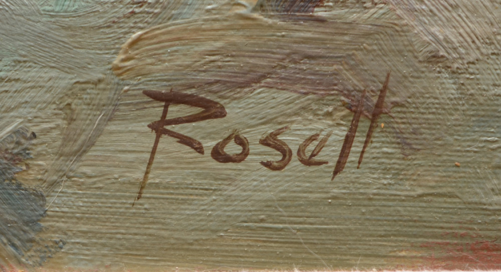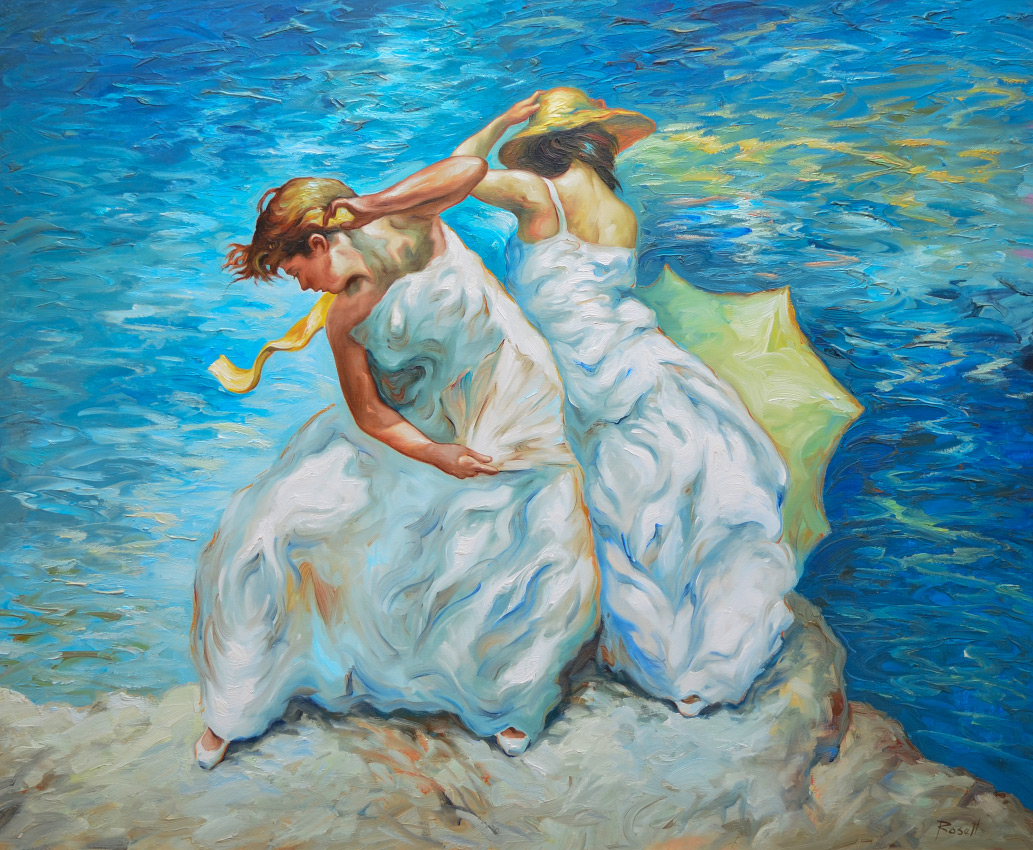 LARGE IMPRESSIONIST PAINTING OF TWO YOUNG GIRLS BY ROSELL: Two Girls by the Water's Edge, Oil/Canvas, sight size 32'' x 39 1/4'', signed lower right, contemporary frame, 44'' x 50 1/2''.