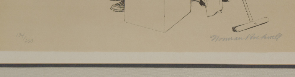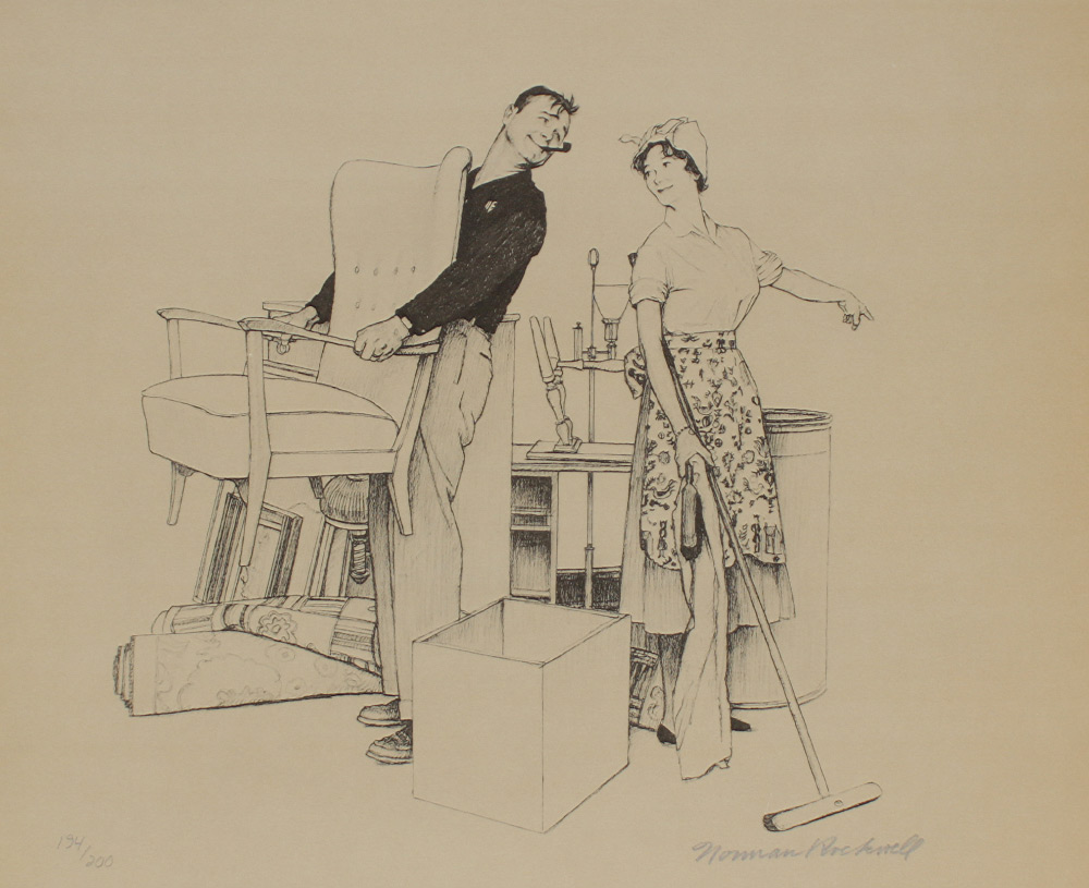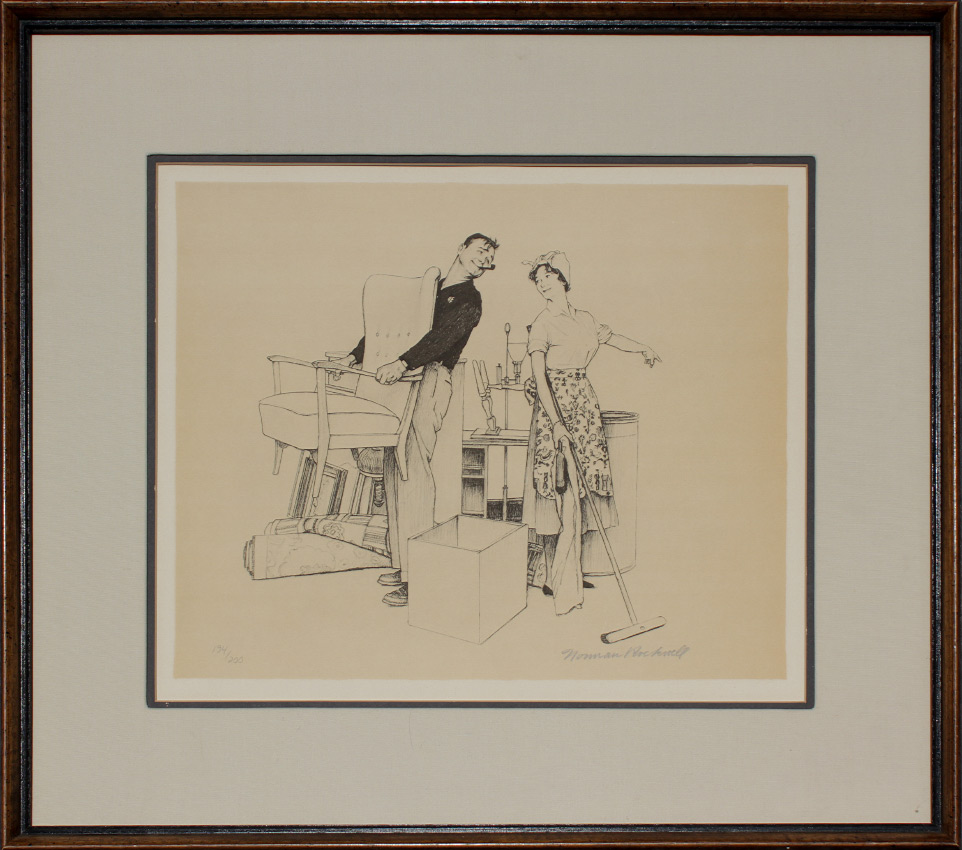 ROCKWELL, Norman, (American, 1894-1978): Couple Cleaning House, Lithograph, sight size 14 1/2'' x 17 3/4'', pencil signed lower right, numbered 194 of 200 lower left, framed, 22 1/2'' x 26''.