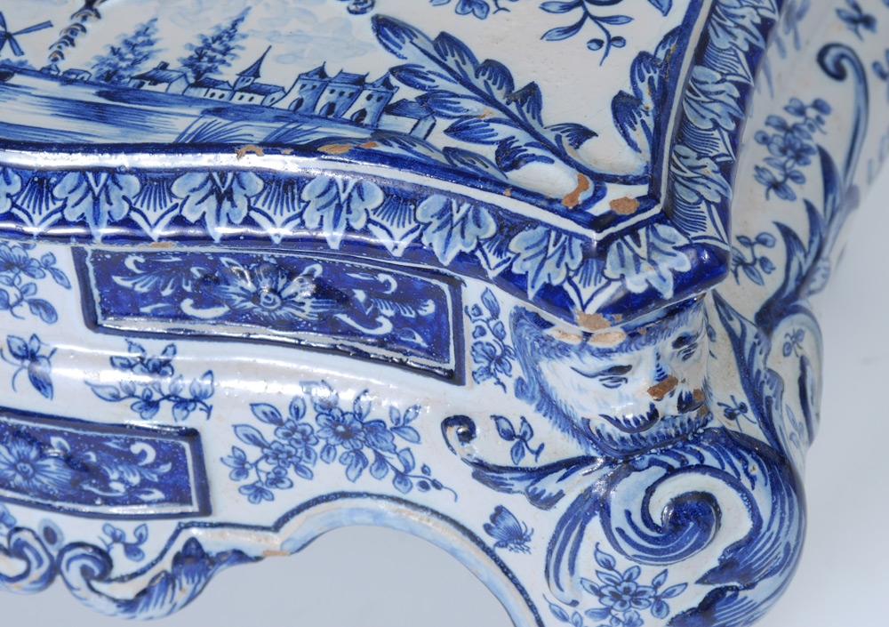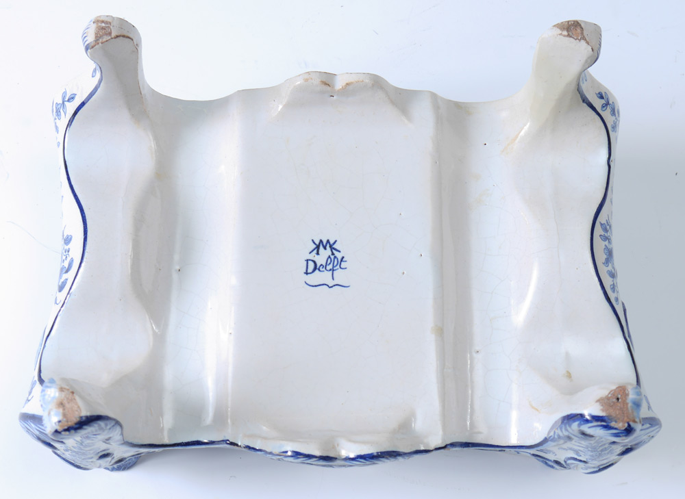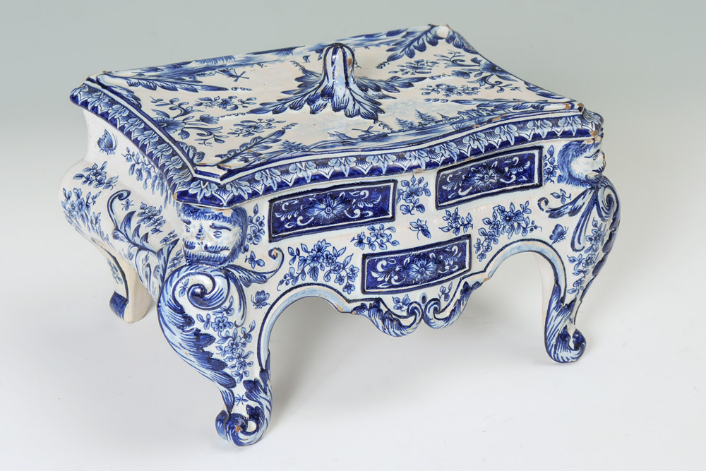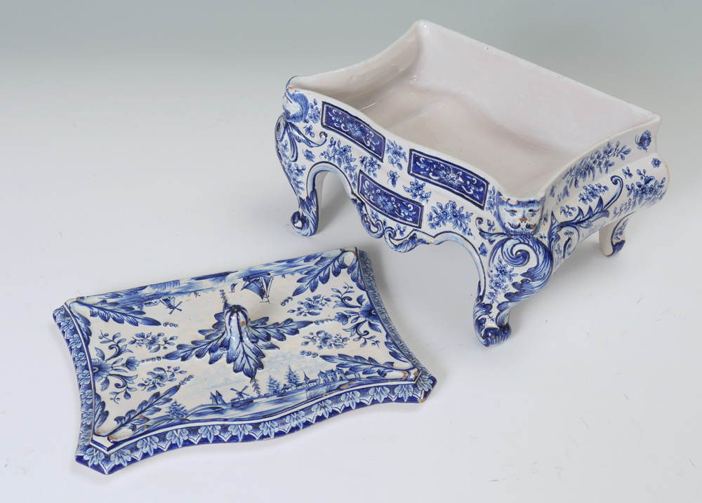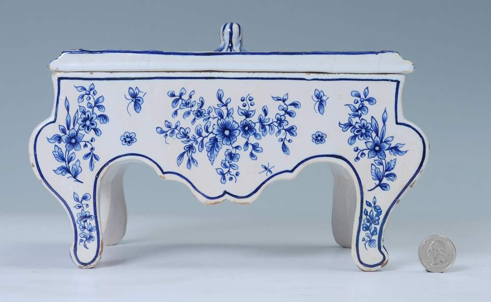 DELFT BOX ON LEGS: Removable lid with typical blue Delft designs, shaped body with masquerons at corners on legs, marked on base. Overall measures 6 1/2'' h. x 10 1/2'' x 6 1/2''.
