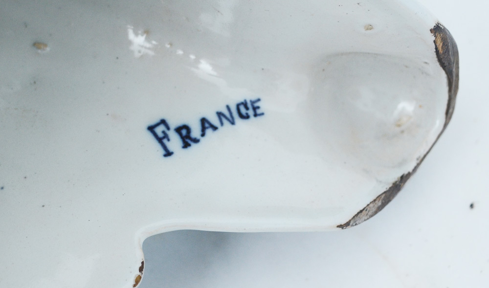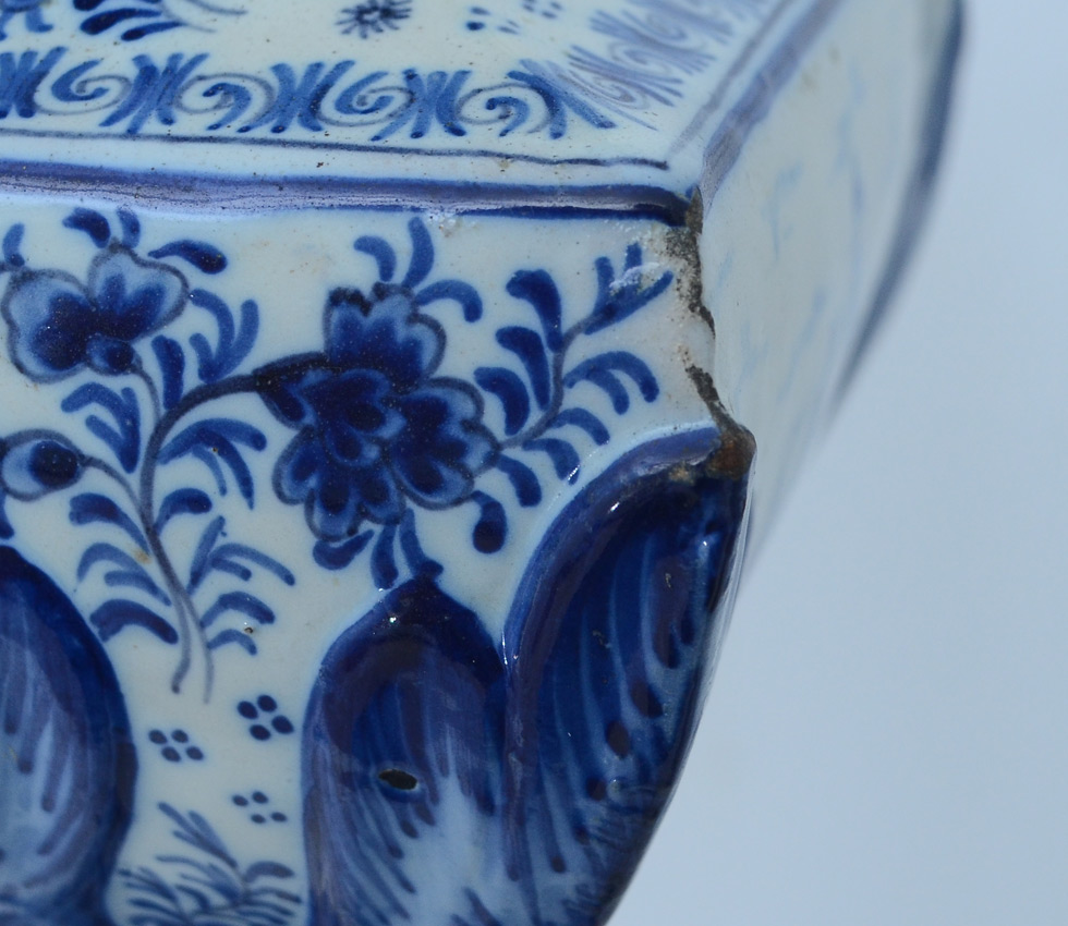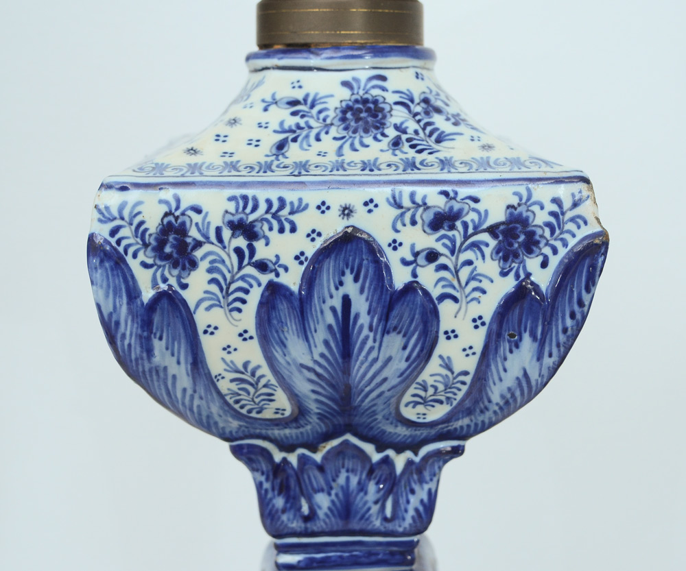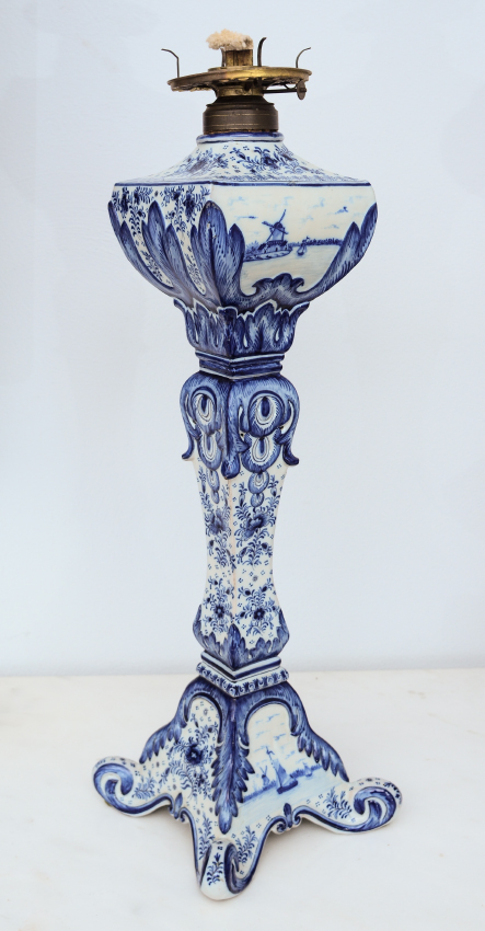 TALL FRENCH DELFT STYLE FAIENCE OIL LAMP: Blue and white decorated with typical Delft type scenes and floral decoration, original burner, marked France under base. Overall measures 26'' h. x 8 1/2'' x 8 1/2''.