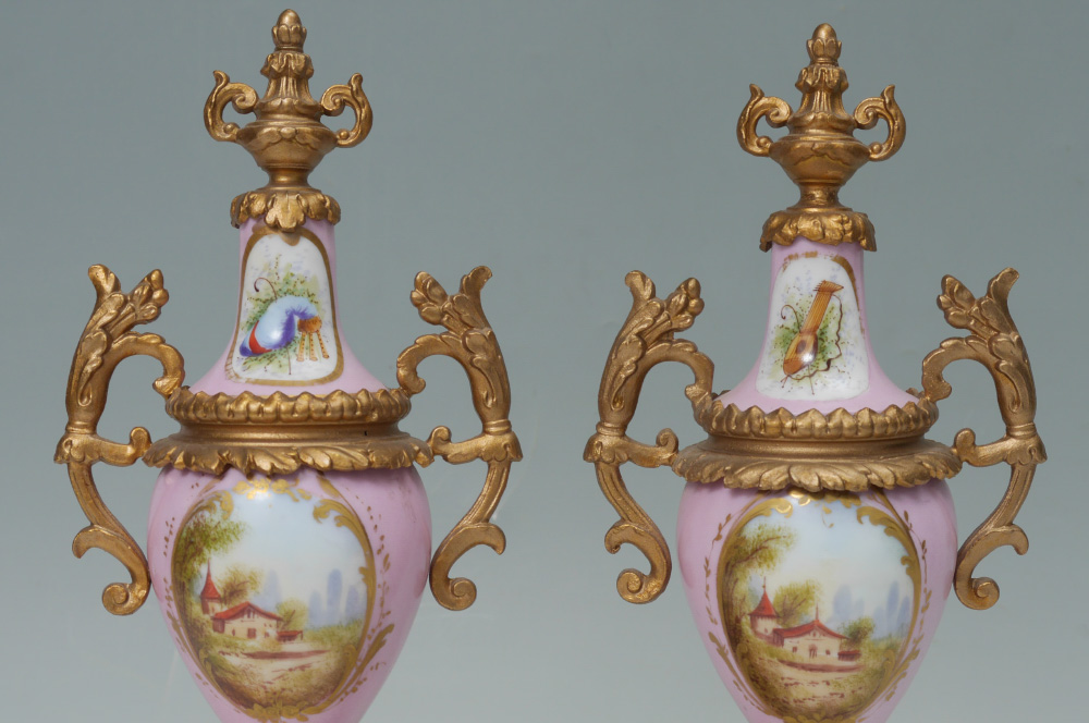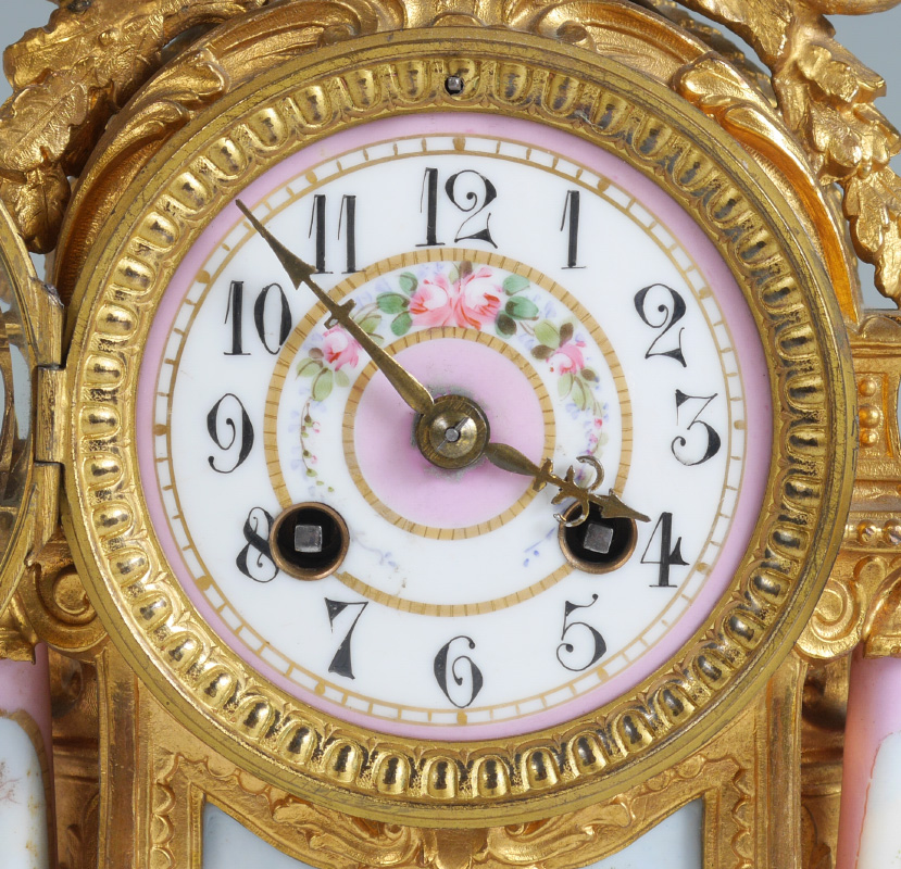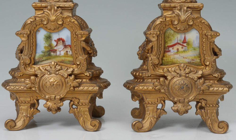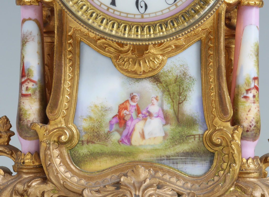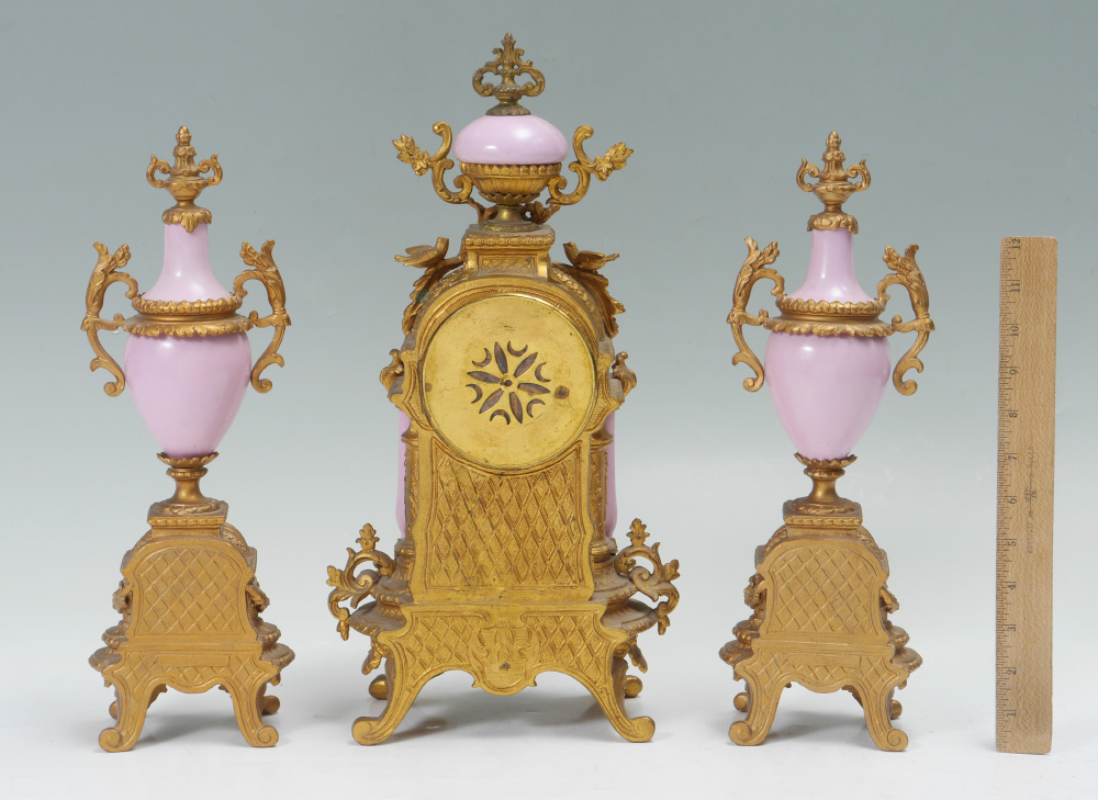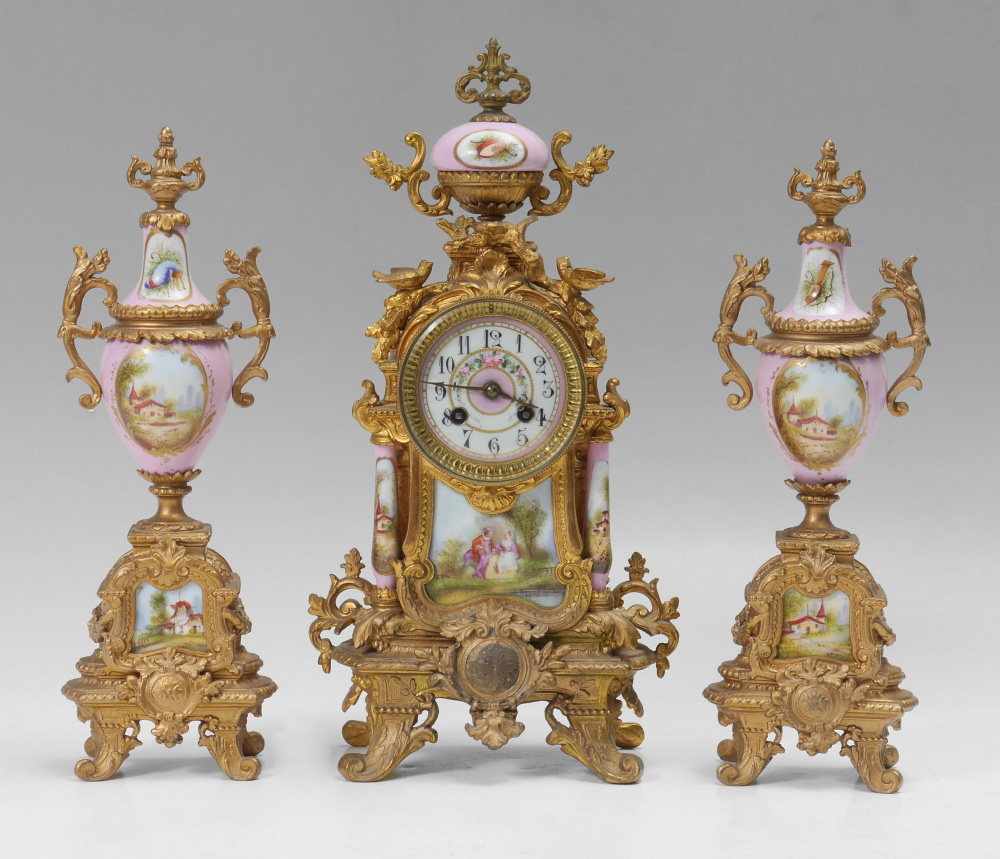 FRENCH GILT BRONZE MANTLE CLOCK GARNITURE SET: 3 pieces total, clock with porcelain urn finial, gilt bronze case with birds, floral and foliate decoration. Porcelain insert with outdoor genre scene of lovers, porcelain columns. Dial with floral decoration and Arabic numerals. Louis Boname French time and strike movement. 16 3/4'' h. x 8 3/4'' x 4 1/2''. Sold with matching garniture, 14 1/2'' x 5'' x 2 3/4''