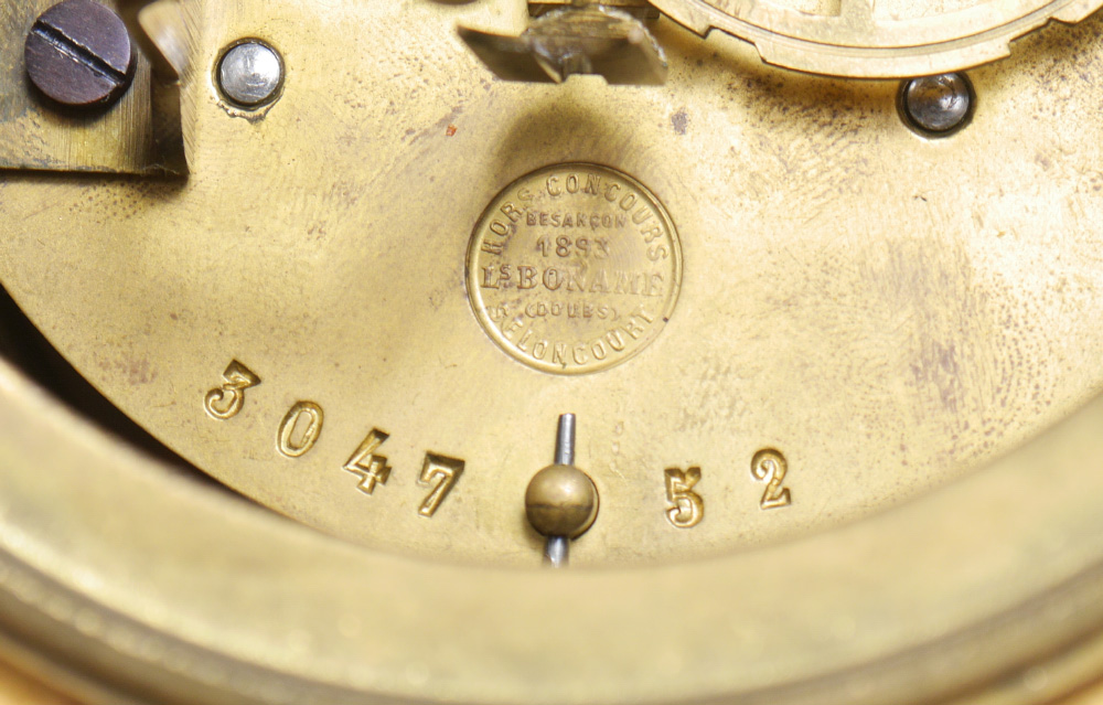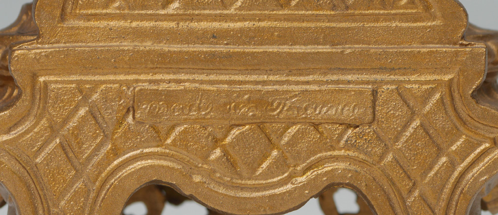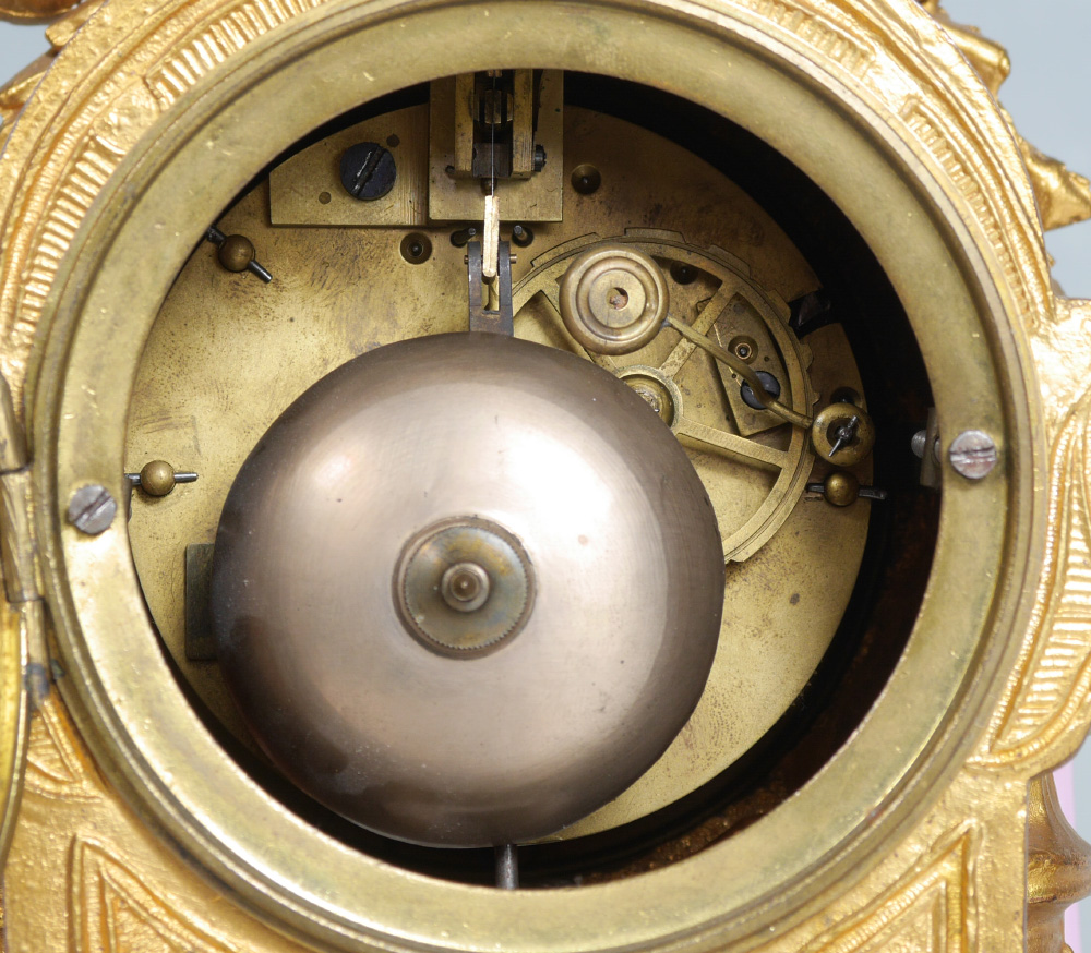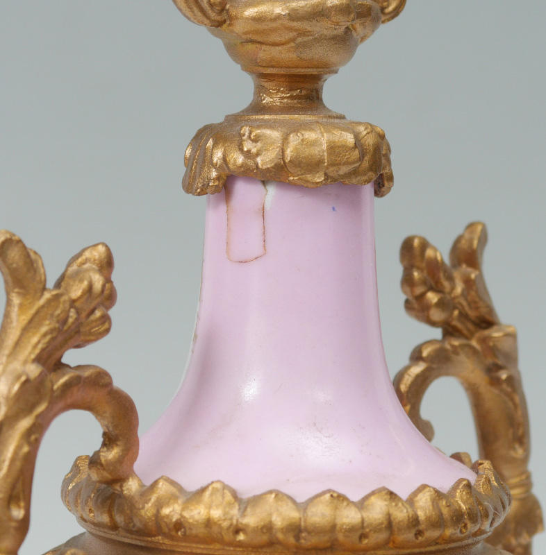 CONDITION: Currently running however not guaranteed to continue or keep accurate time. Repair to chip on one of the garniture, visible discolored spots to the gilt. Replacement pendulum in office.
