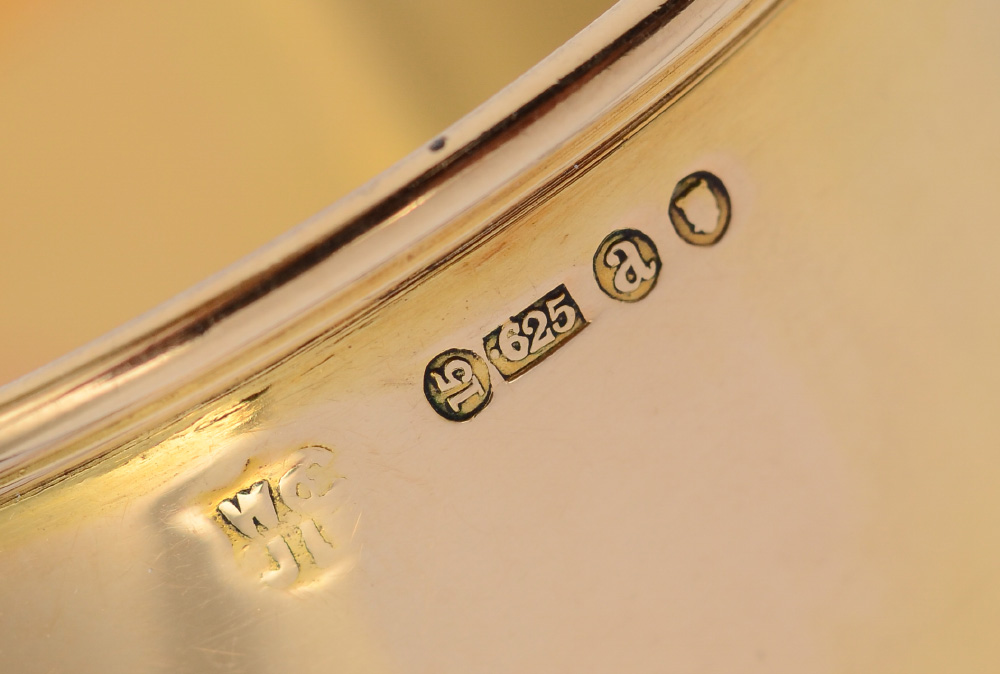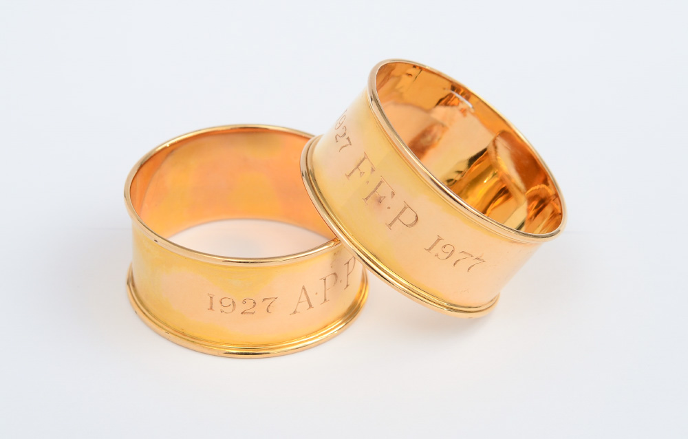 2 ENGLISH 15K GOLD NAPKIN RINGS: Hallmarked with William Gibson & John Langman makers mark London, .625 15K marks. Monogrammed A.F.P. and F.F.P. 1927-1977. 1 3/4'' dia., approx. 35.8 grams. Gibson and Langman later changed the firms name and became the Goldsmiths & Silversmiths Co. Ltd. in 1898.