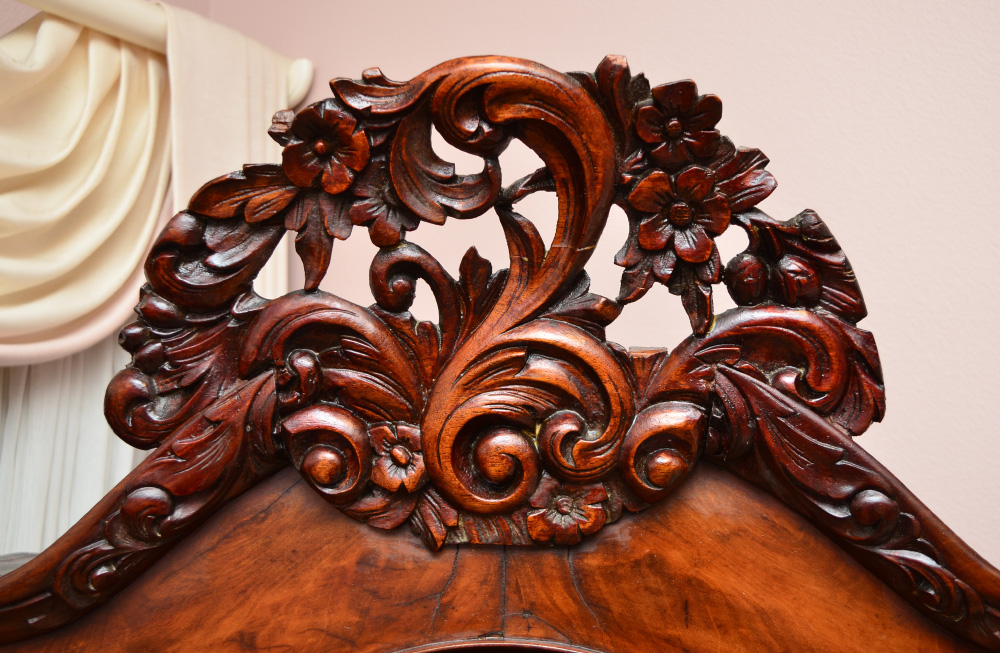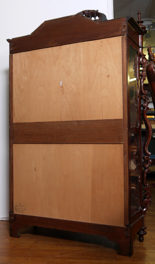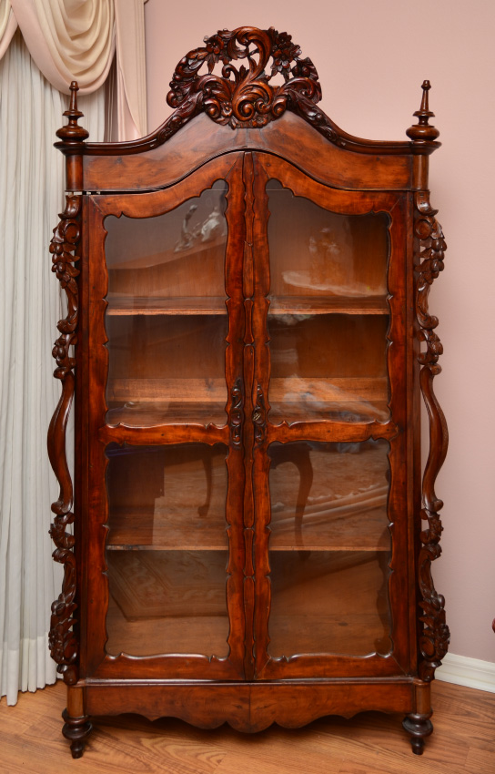 CARVED VICTORIAN CURIO CABINET: Arched pediment with foliate scroll crest, 2 turned spire finials over shaped glass doors framed in carved wood. Canted corners with carved and shaped floral garland stiles, turned front legs. 4 wood shelves, overall measures 75 1/2'' h. x 43'' x 16 1/2''.