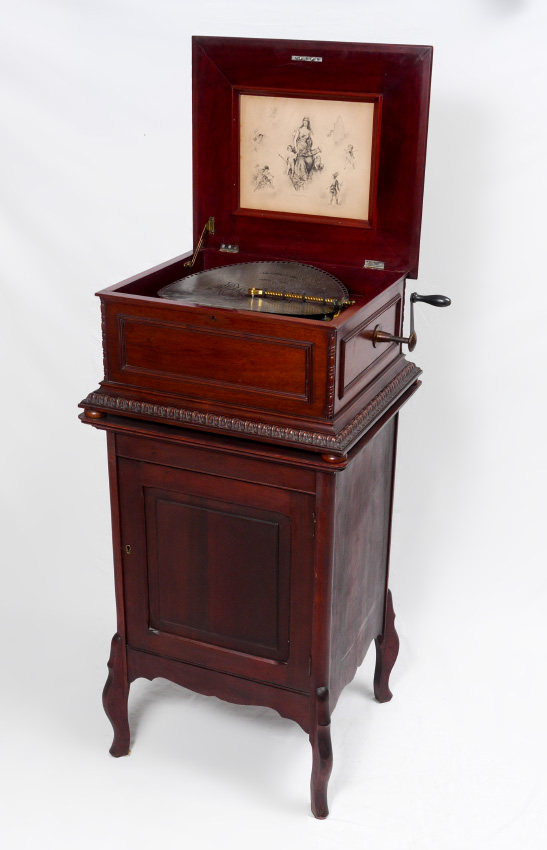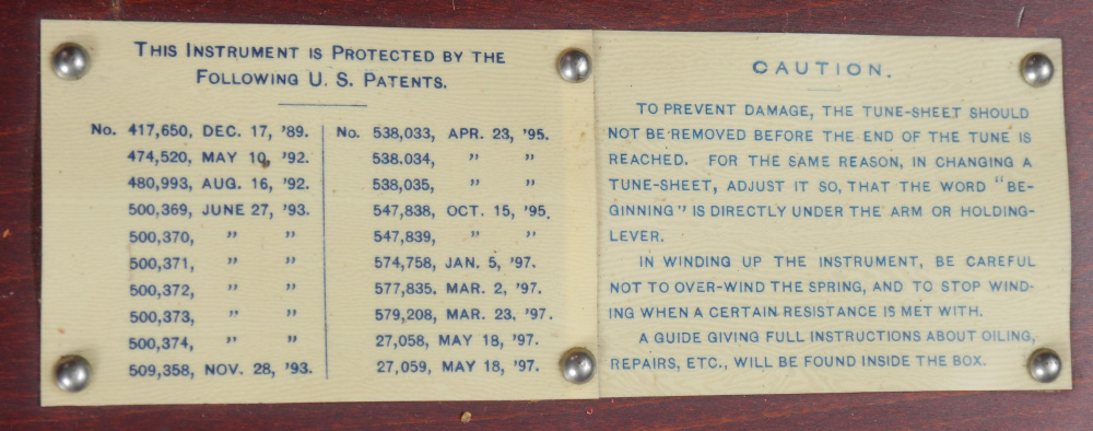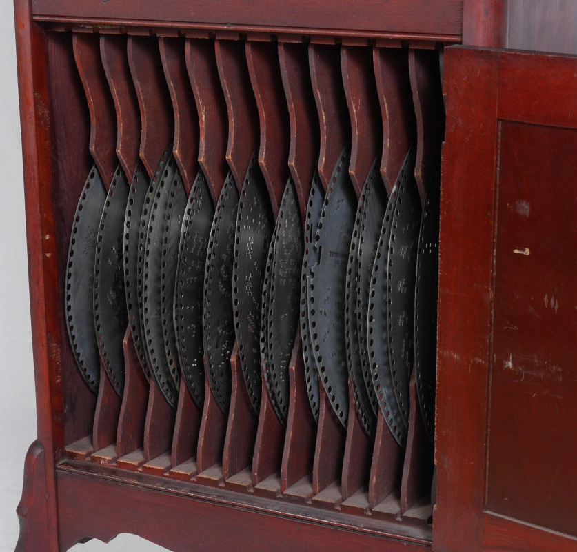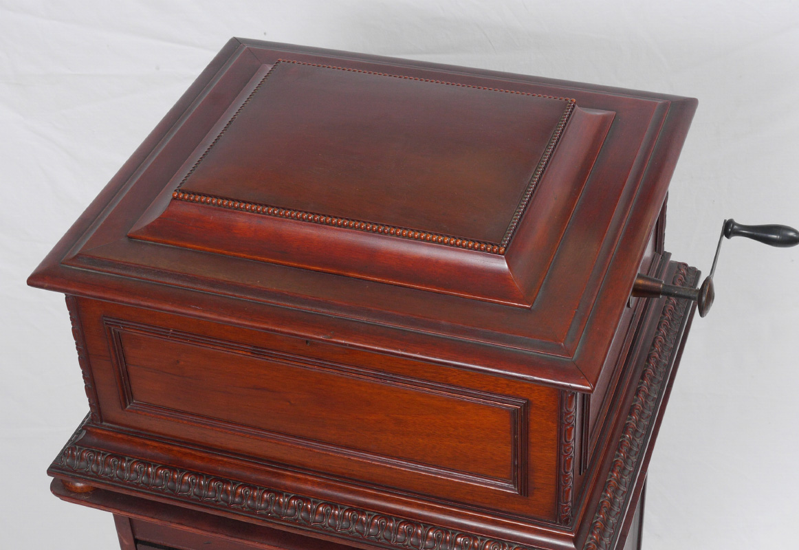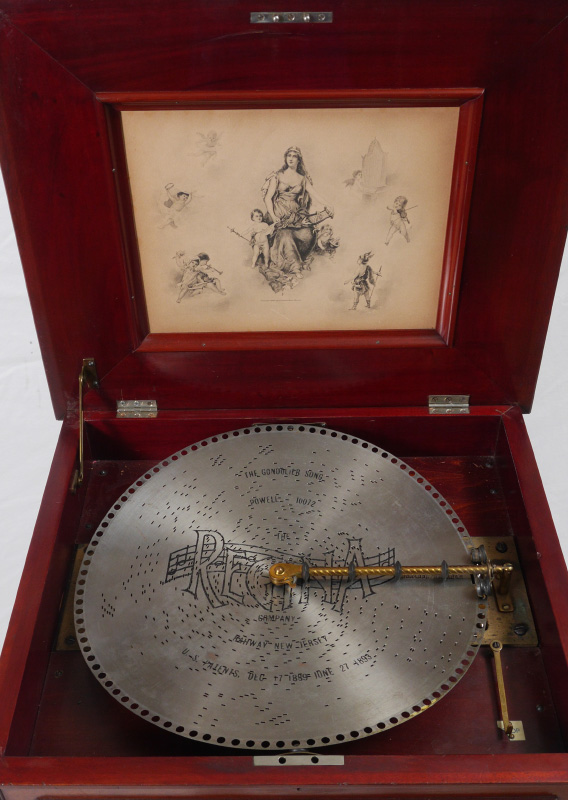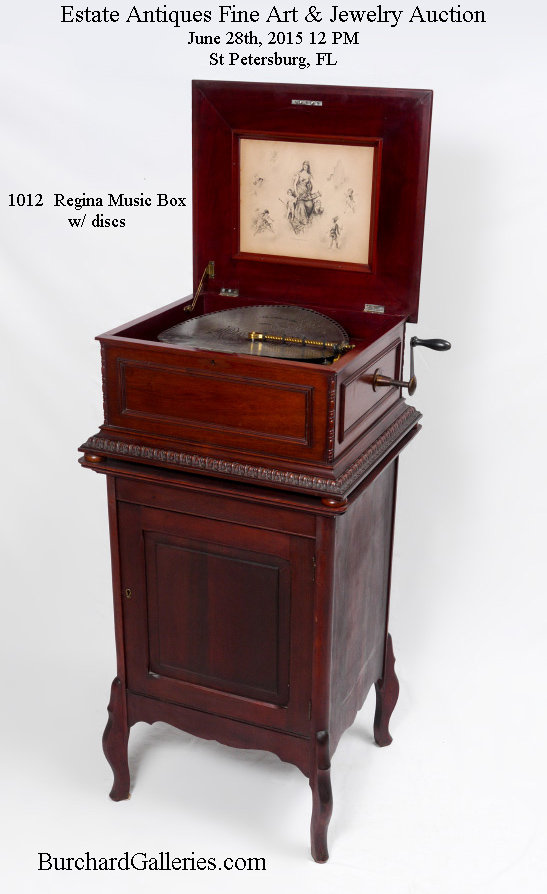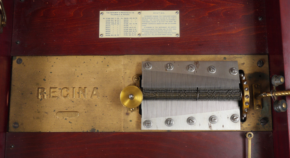 MAHOGANY REGINA 15 1/2'' MUSIC BOX AND STAND: Music box with shaped top gadroon edge, carved corners and base. Double comb, serial number 33927, original celluloid instructions and lithograph paper insert, 12 1/4'' h. x 22 3/4'' x 20 1/4''. Sold with music stand holding twenty one 15 1/2'' disks, 34 1/4'' h. x 23'' x 20 1/2''.