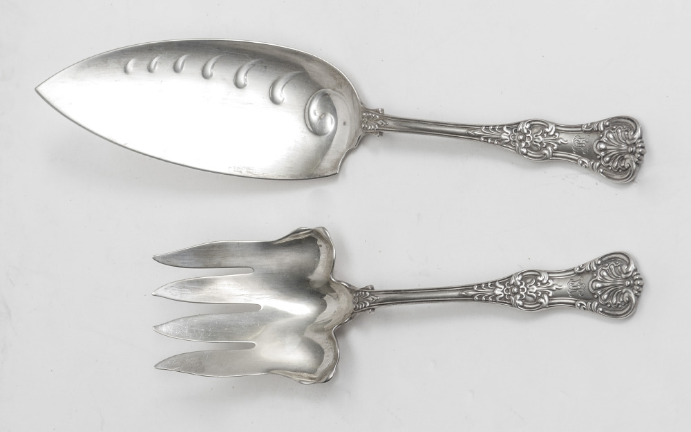 TIFFANY & CO ENGLISH KING FISH SERVING SERVICE: 2 pieces in the English King pattern by Tiffany & Co. to include fish fork (9 1/2'') and server (12 1/8''). Both monogrammed, 10.3 troy oz.