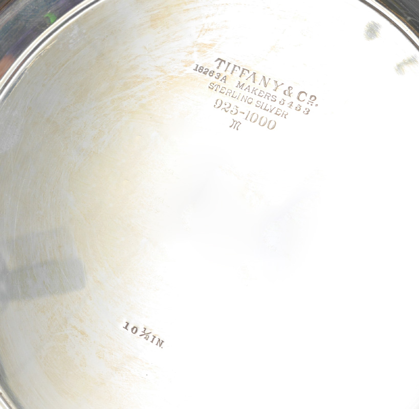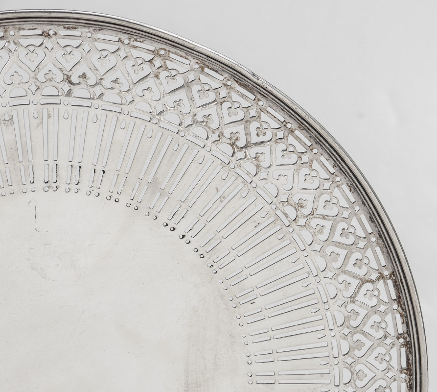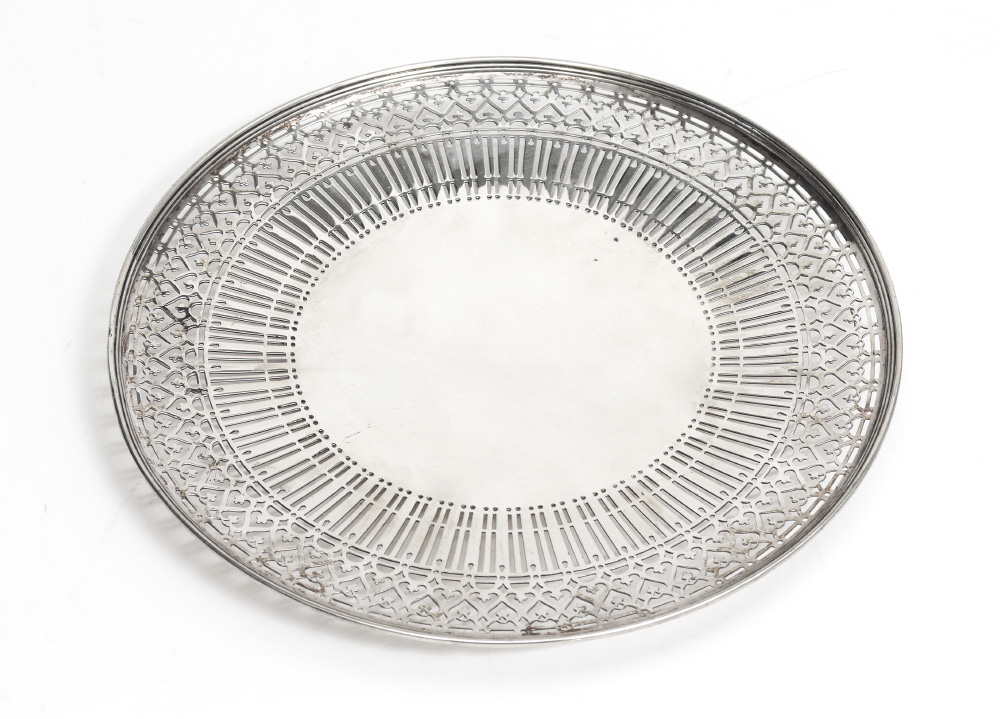 TIFFANY & CO STERLING RETICULATED FOOTED DISH: Pierced reticulated rim, marked on base with ''Tiffany & Co., 18263A Makers 5453, Sterling Silver, 925-1000, M, 10 1/2 IN.'' 1 1/8'' h. x 10 1/2'', approx. 13.5 troy oz.