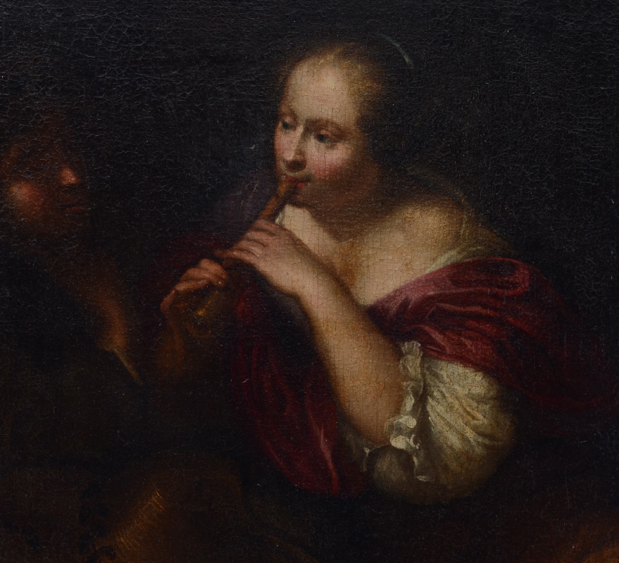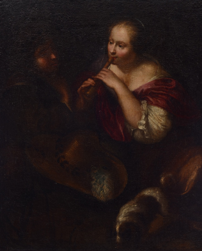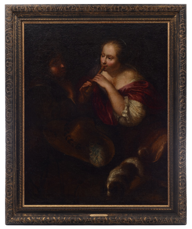 THE FLUTE LESSON PAINTING AFTER JAN STEEN: Oil/Canvas, sight size 41'' x 24 5/8'', carved frame, 37 1/2'' x 30 1/4''.