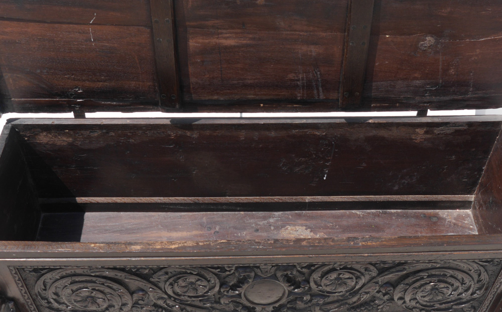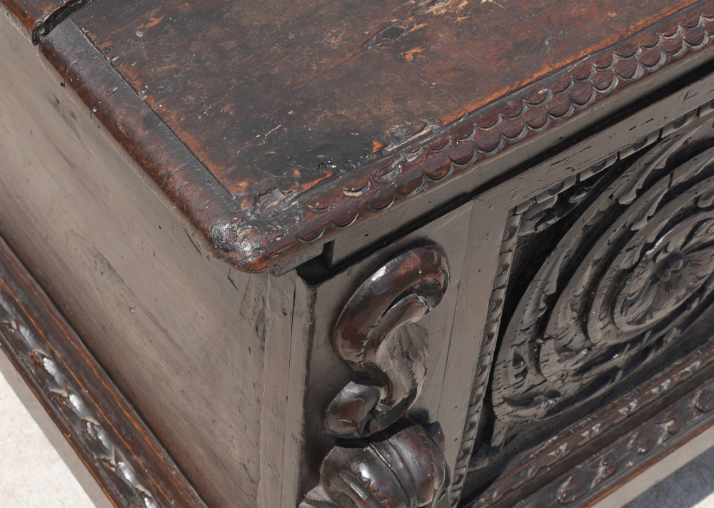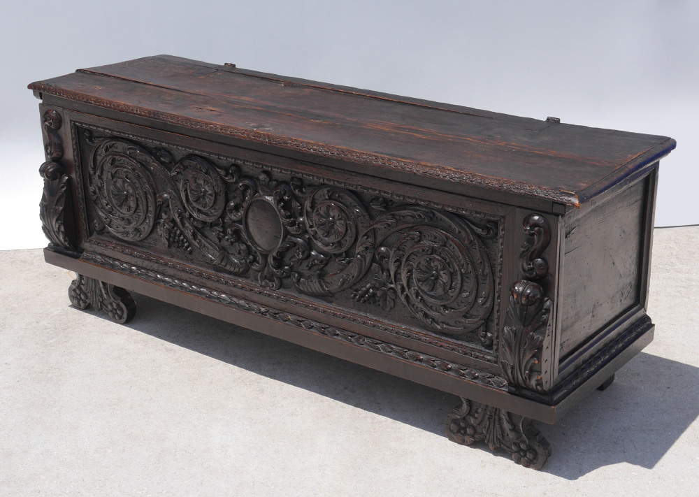 19TH CENTURY CARVED ITALIAN WALNUT CASSONE: Profusely carved front with medallion center and foliate scrolls, applied foliate decoration to stiles, carved front feet. Hinged single board lid with iron hardware, no lock. Overall measures 25 1/4'' h. x 65 1/2'' x 20 1/4''.
