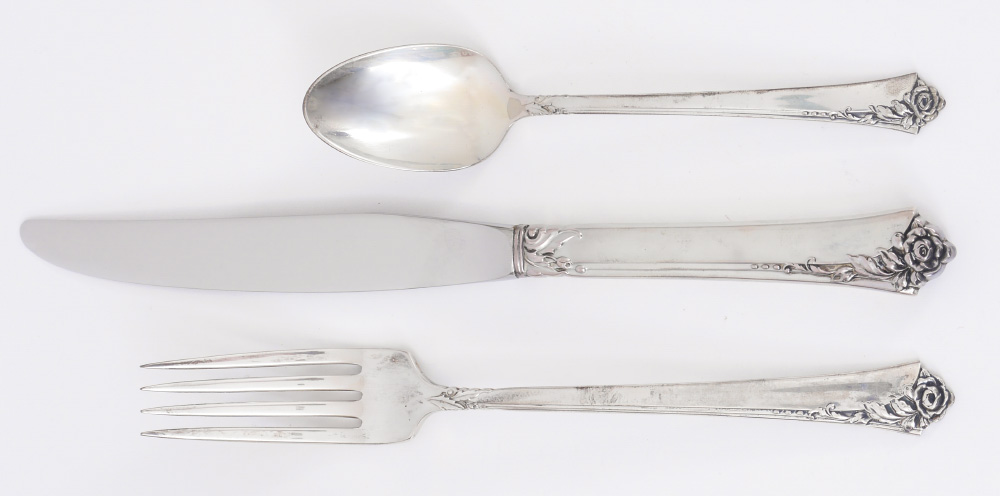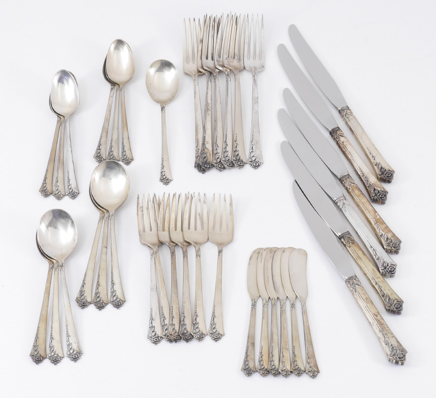 HEIRLOOM STERLING DAMASK ROSE FLATWARE SERVICE: Approx. 37 pieces total, luncheon set for 6 in the Damask Rose pattern by Heirloom Sterling to include 6 forks (7 3/4''), 6 salad forks (6 1/2''), 6 teaspoons (6 1/8''), 6 soup spoons (6 1/2), 6 hollow knives (9 3/8''), 6 solid butter knives (5 3/4''), sugar shell spoon (6 1/8''). Approx. 40.4 troy oz.