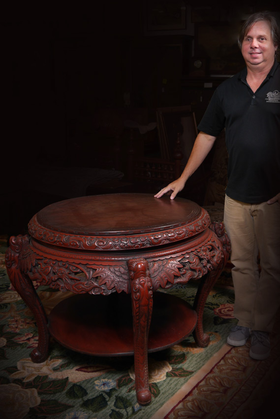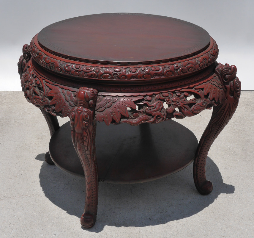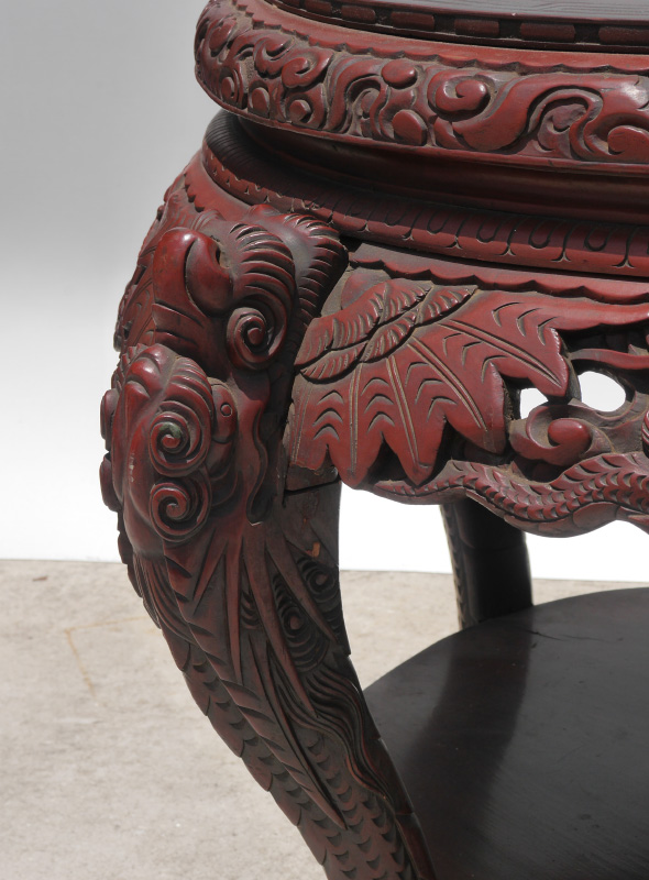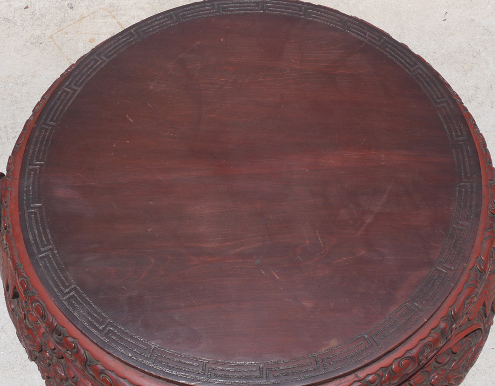 19TH CENTURY CARVED JAPANESE RED LACQUER TABLE: Round top with carved trim, skirt with pierce work dragon motif, carved and shaped legs, lower open shelf. Overall measures 32'' h. x 45'' dia.