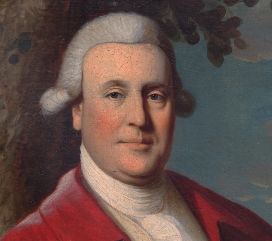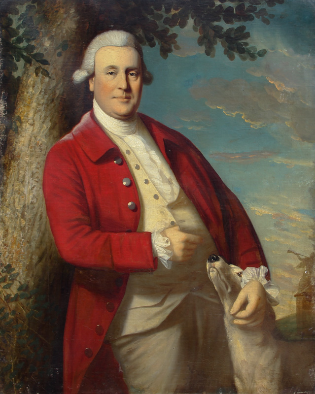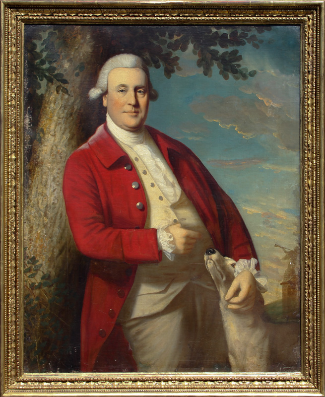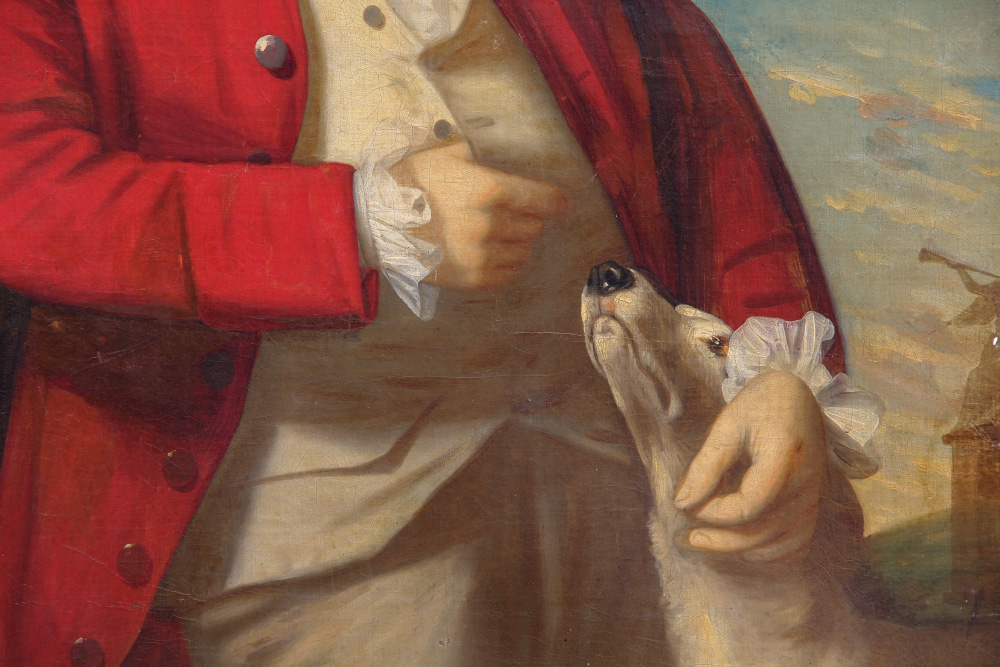 FINE EARLY PORTRAIT OF A GENTLEMAN WITH HOUND AFTER THE FOX HUNT PAINTING: Oil/Canvas, sight size 49'' x 39 1/4'', no visible signature, fine gilded frame, 55 1/4'' x 45 1/2''.