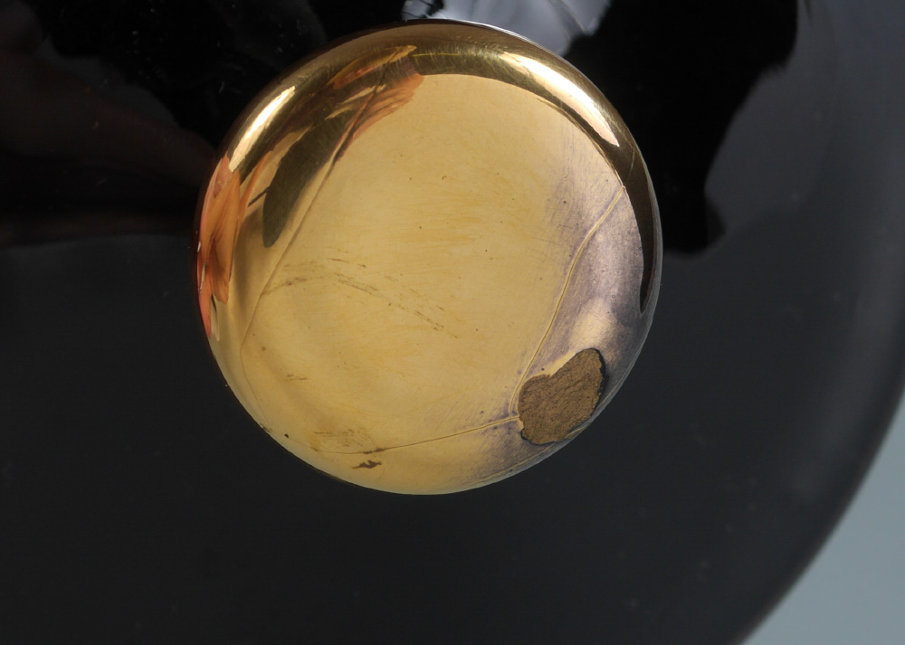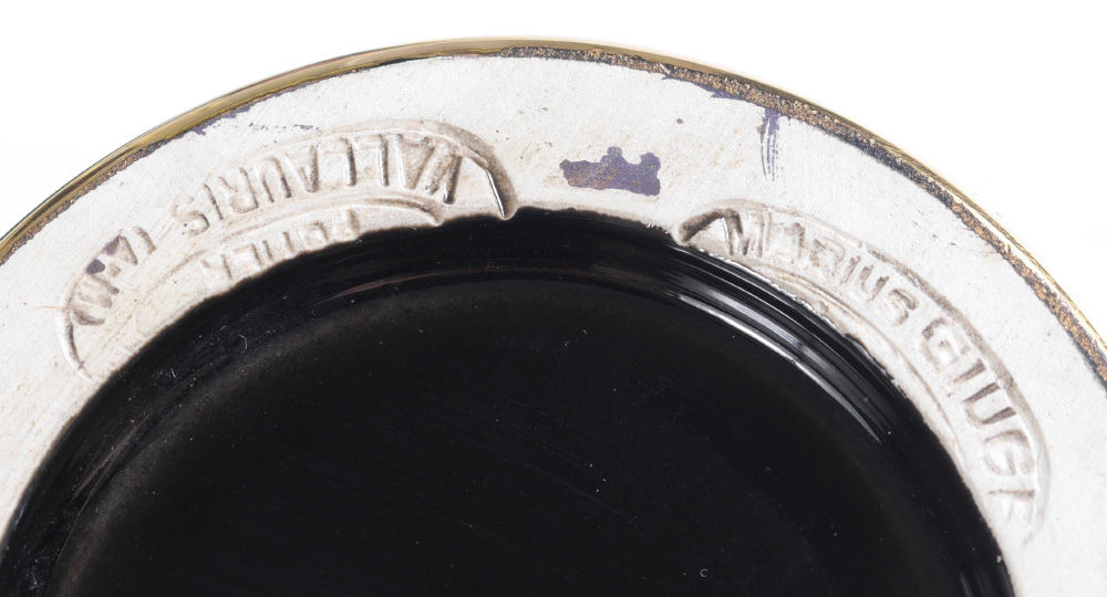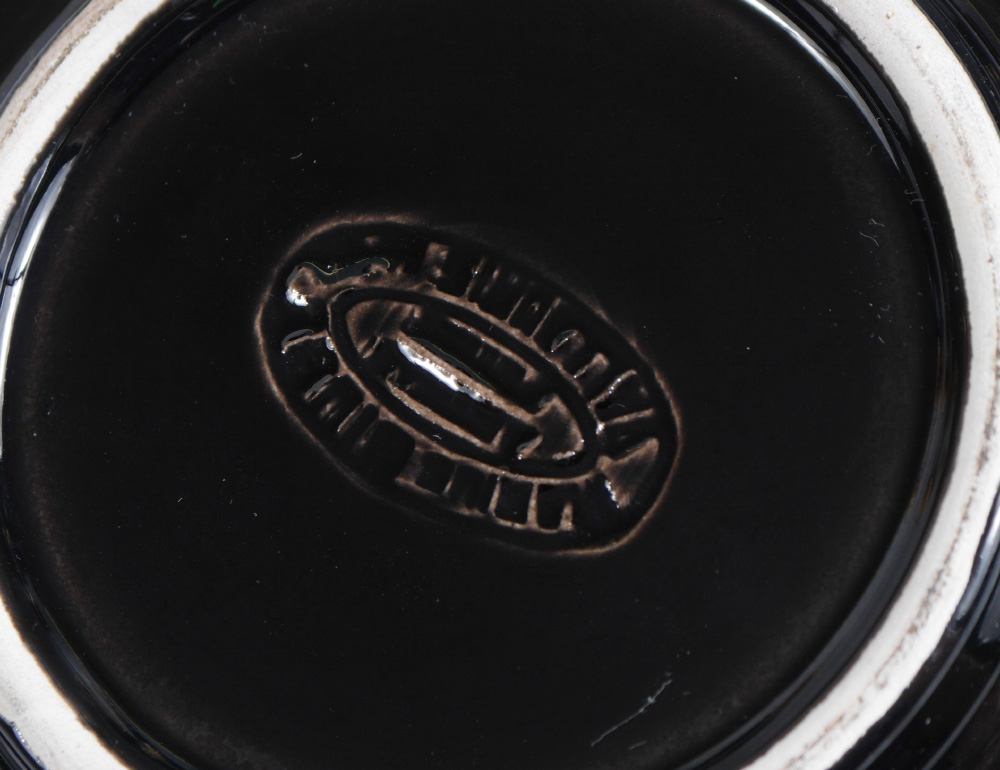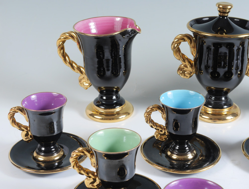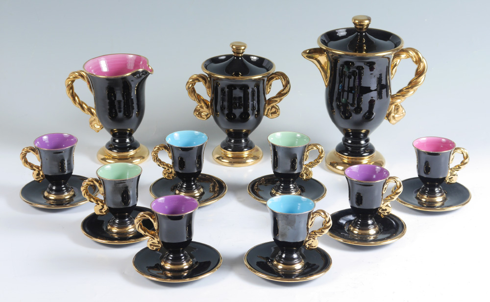 MARIUS GIUGE, VALLAURIS FRENCH COFFEE SET: Coffee pot, cream pitcher and covered sugar with 8 cups and saucers. Featuring a gilt rope twist handles and accents on a striking black ground with multi-colored interiors. Pot measures 10'', creamer and sugar approx. 7''.
