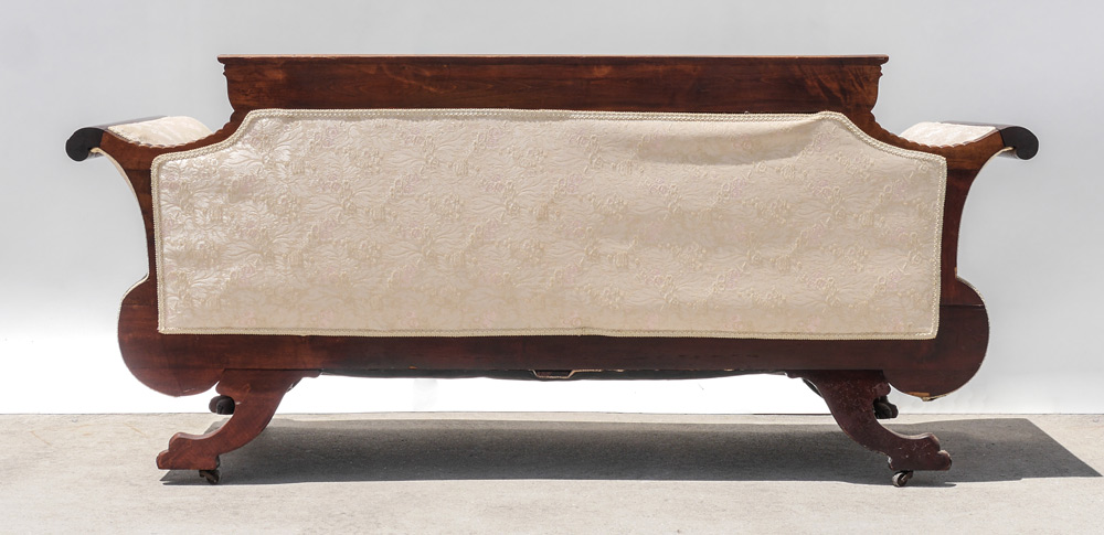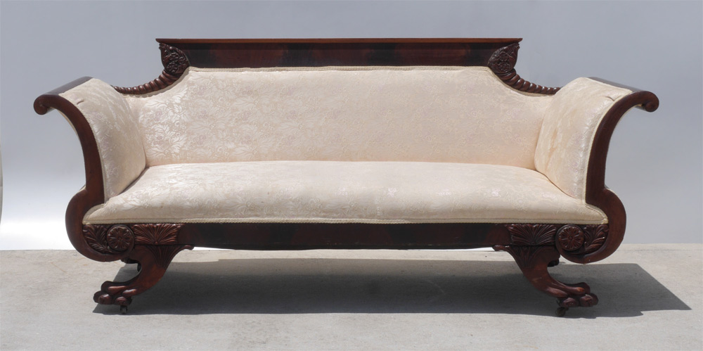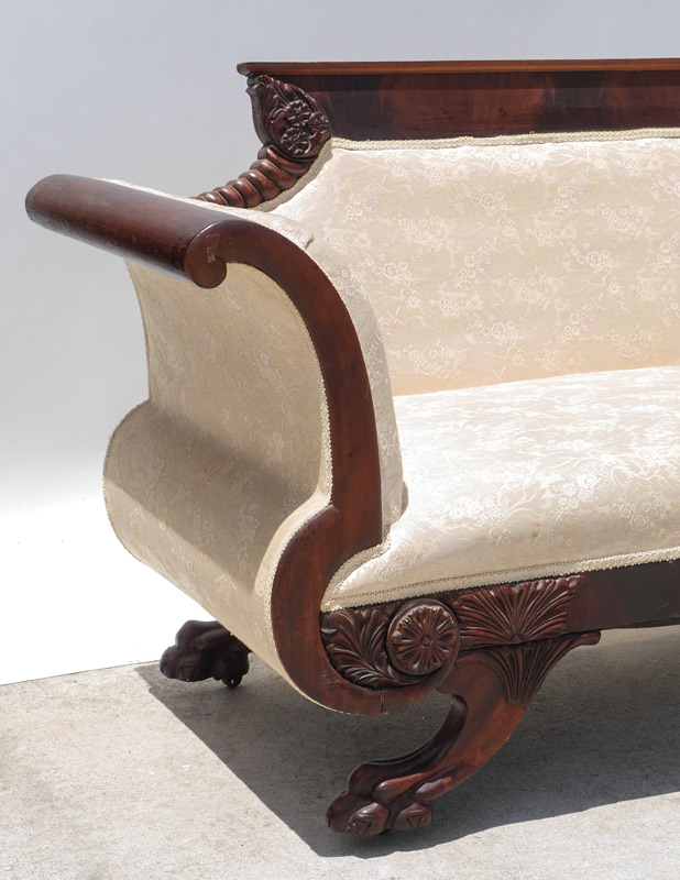 FEDERAL STYLE MAHOGANY SOFA: Back rail with carved cornucopia decoration at either end, outward scroll arms, skirt with carved floral decoration, paw feet on castors. Floral pattern ivory upholstery, overall 35'' h. x 78'' x 27''.