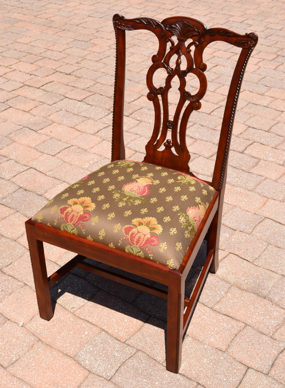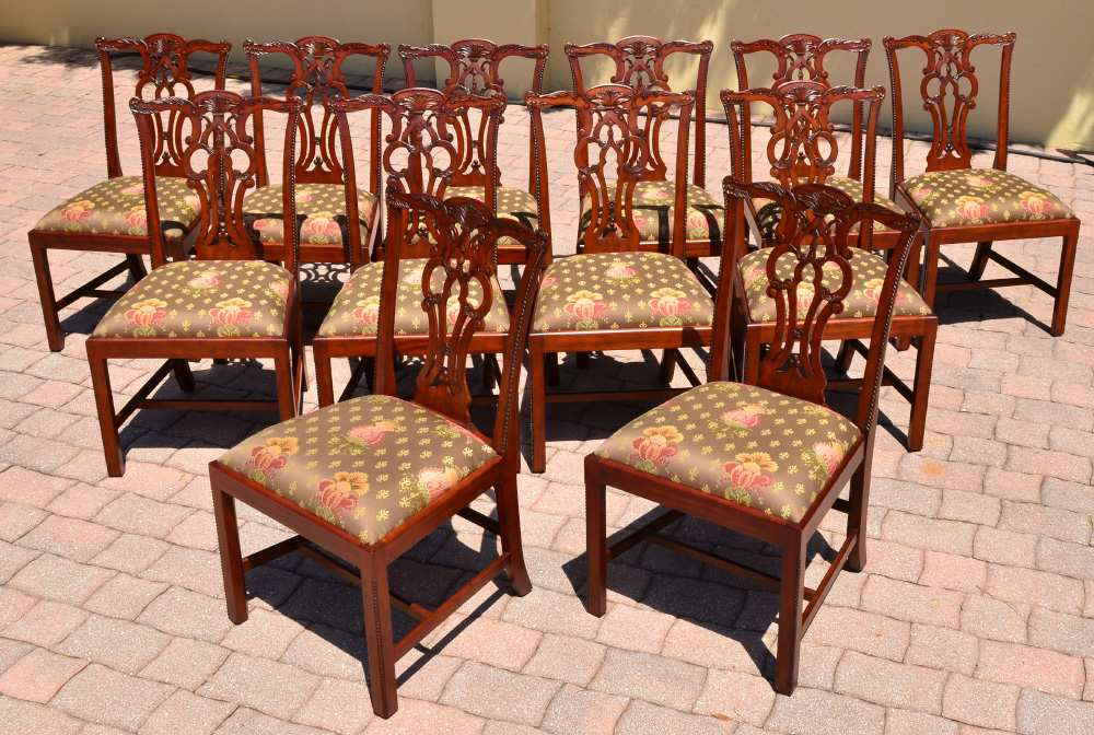 12 MAITLAND SMITH CHIPPENDALE STYLE DINING CHAIRS: Carved and pierced backs with shell, foliate and gadroon decoration, front legs with gadroon carving on edges. Floral upholstery, 39'' h. x 22 1/4'' x 24''.