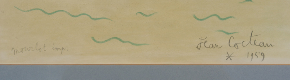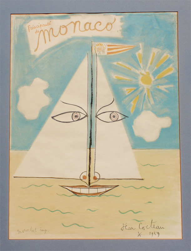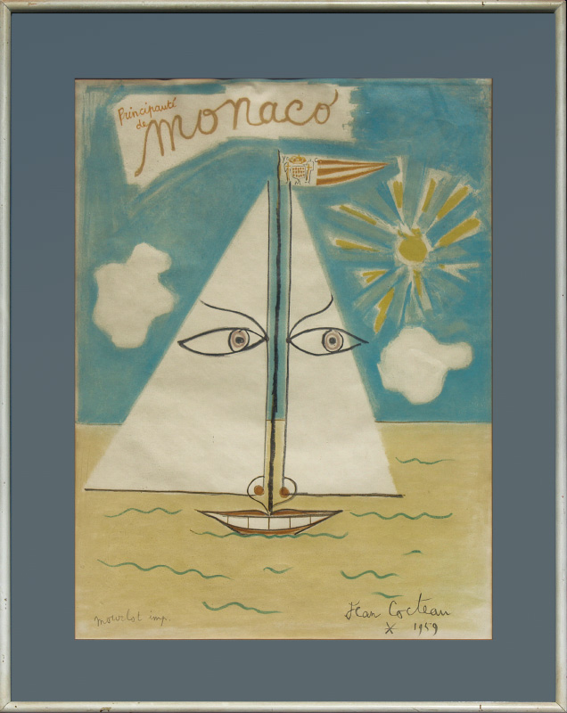 JEAN COCTEAU MONACO MOURLOT POSTER: Sight size 25'' x 18 1/2'', size with margins 25 1/2'' x 19 1/4'', signed and dated in the plate 1959, contemporary frame, 32'' x 25 1/2'', inscribed in pencil verso ''Originale litho''.