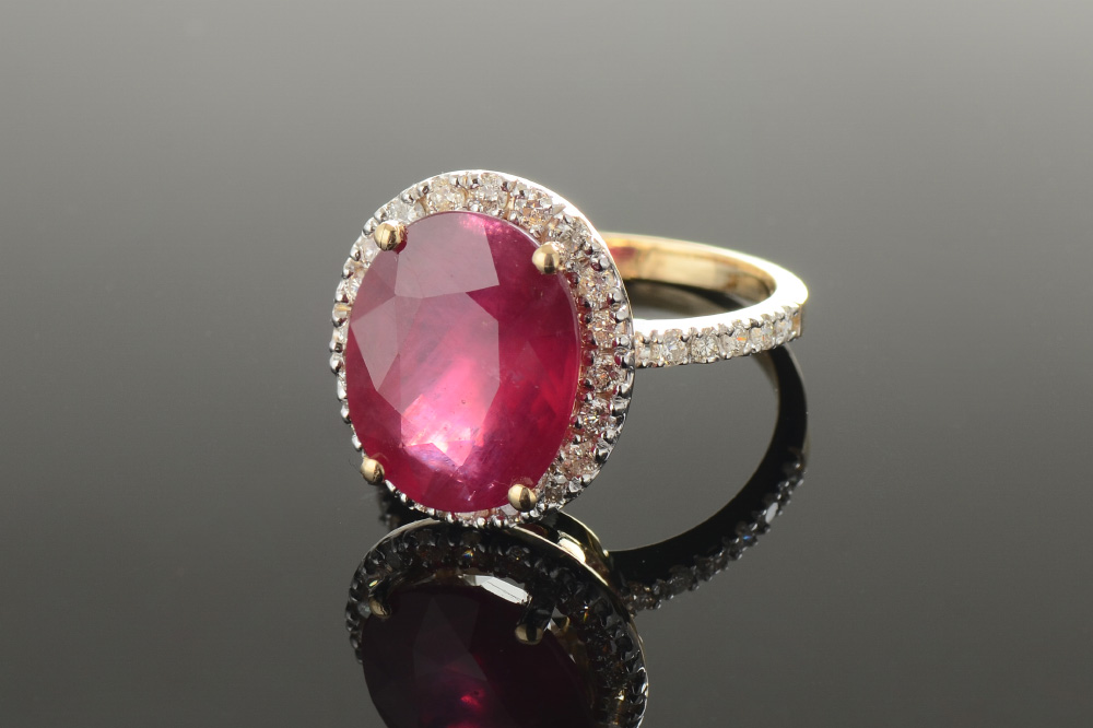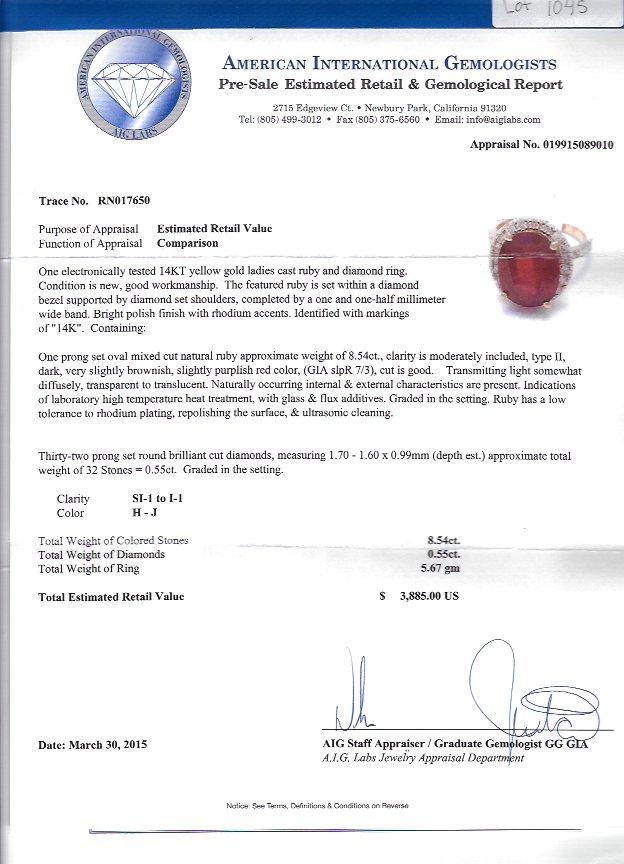8.54 CT RUBY & DIAMOND RING: 14k yellow gold ring with a natural oval mixed cut 8.54 Ct ruby at the center. Lab treated. The ruby is set in a halo of diamonds with additional diamonds set in the shoulders. Diamond weight is approx. .55 Ctw., rated SI1-I1 clarity and H-J color. Size 6. Weight 5.67 grams. Sold with current AGL GIA graduate's appraisal for $3885.