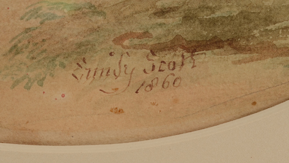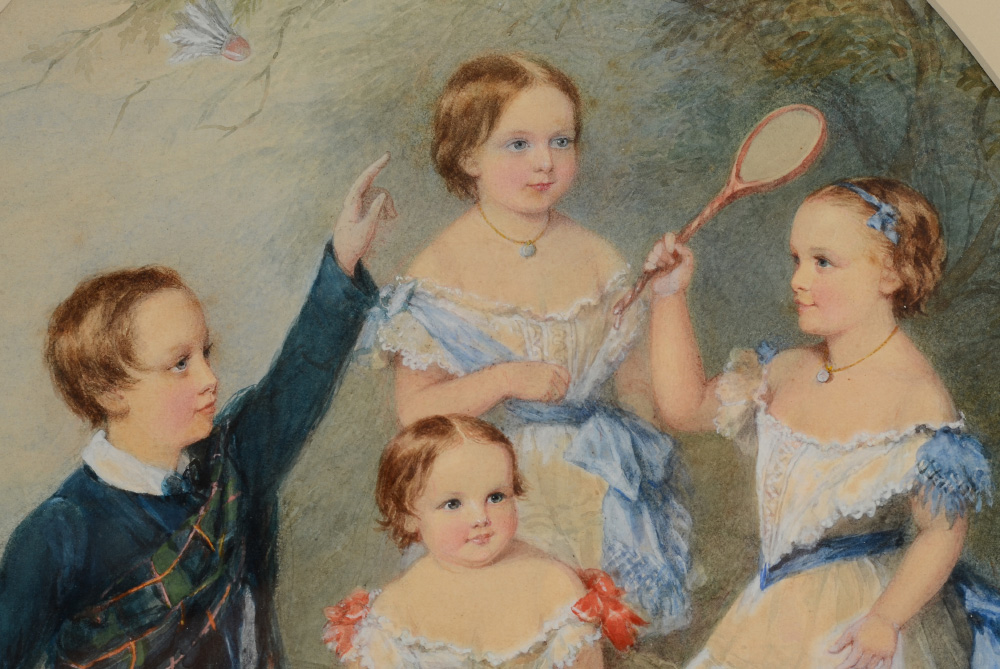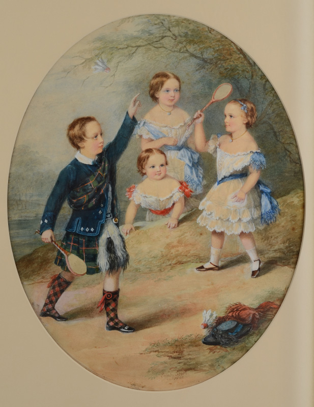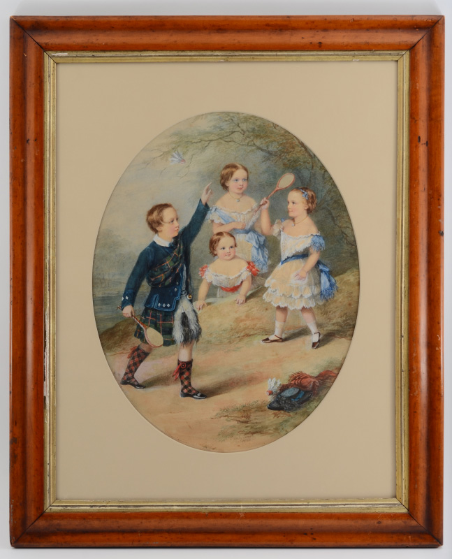 SCOTT, Emily, (American, 19th Century): Children Playing Badminton, Watercolor, oval size 18'' x 14'', signed in lower margin and dated 1860, period maple frame, 28 1/4'' x 23 1/4''.