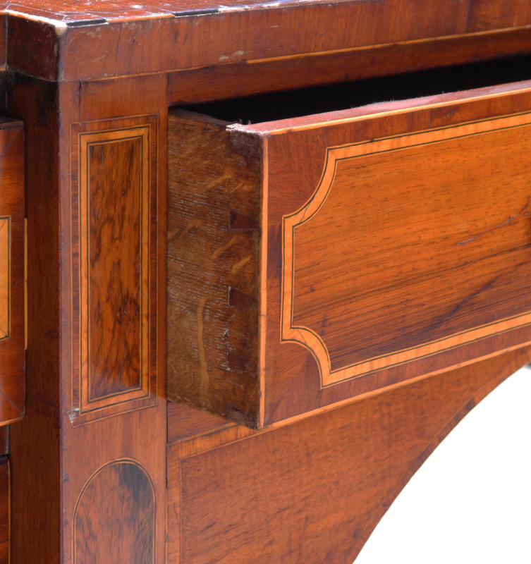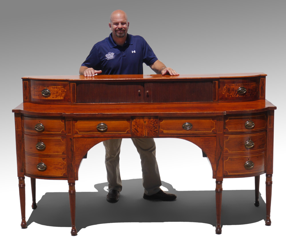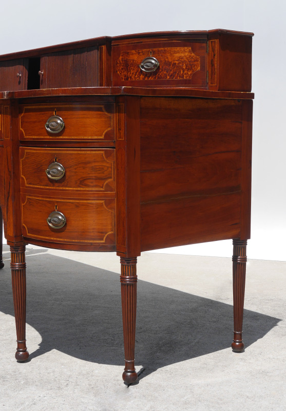 19TH CENTURY MAHOGANY TAMBOUR DOOR SIDEBOARD: Top storage with 2 tambour center doors, curved side doors with birds eye inlaid accents. Shaped top, central drawer over shaped valences, curved side drawers over right side cellarette drawer, left side single door. Tapered fluted legs, 47 1/2'' h. x 82 1/4'' x 30 1/2''.