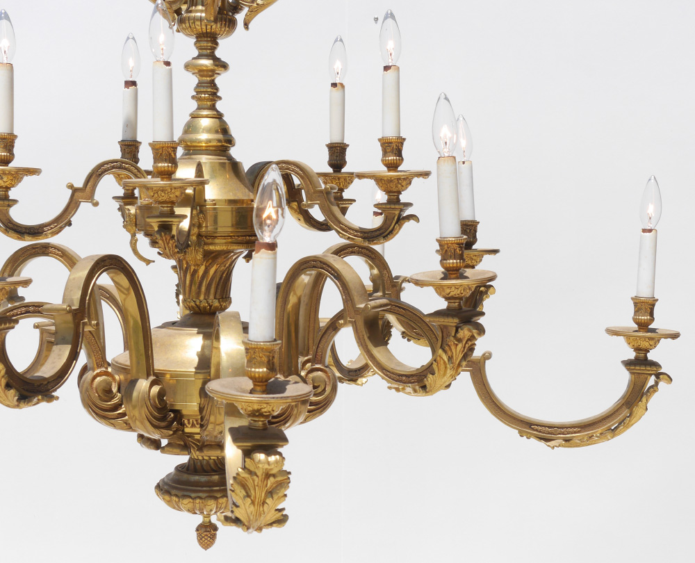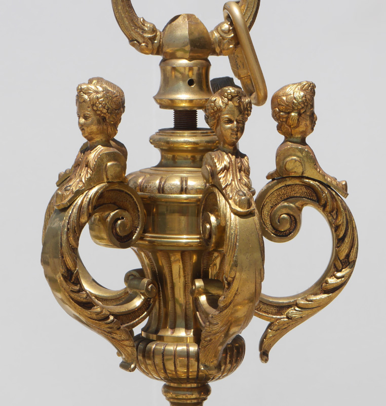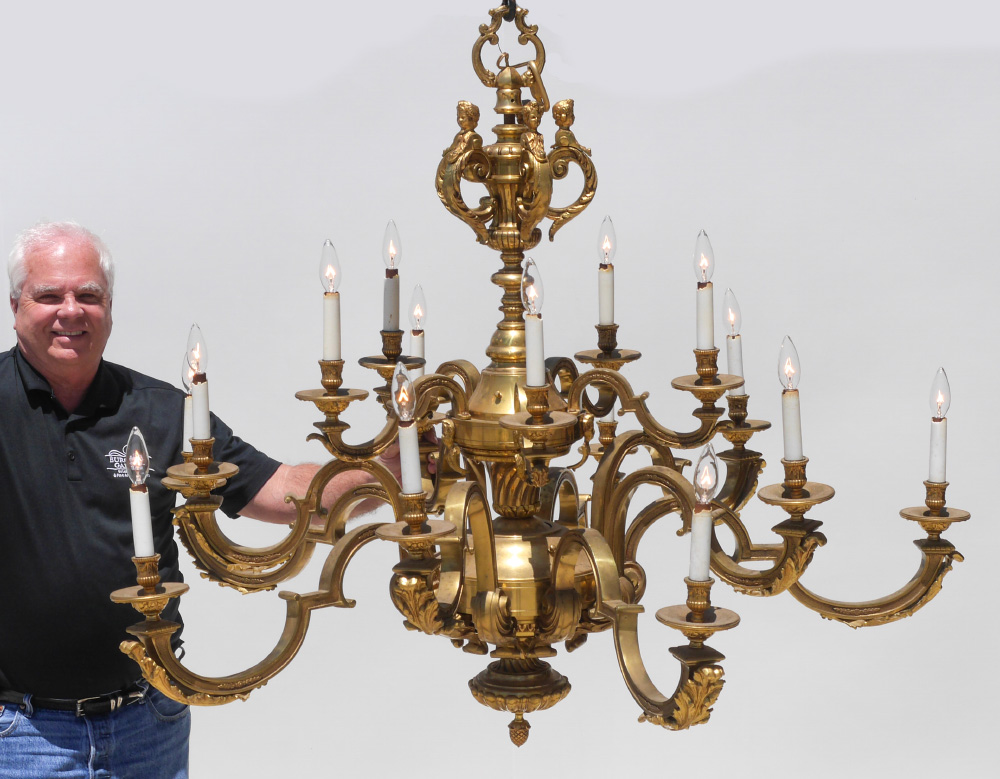 LARGE FIGURAL GILDED METAL CHANDELIER: 15 arms in 2 tiers, figural putti busts on top level, applied foliate decoration, gilded cast metal and brass construction. Overall measures 44'' h. x 48'' dia.
