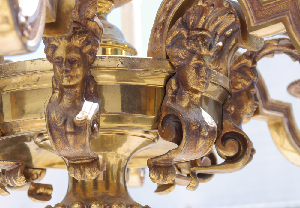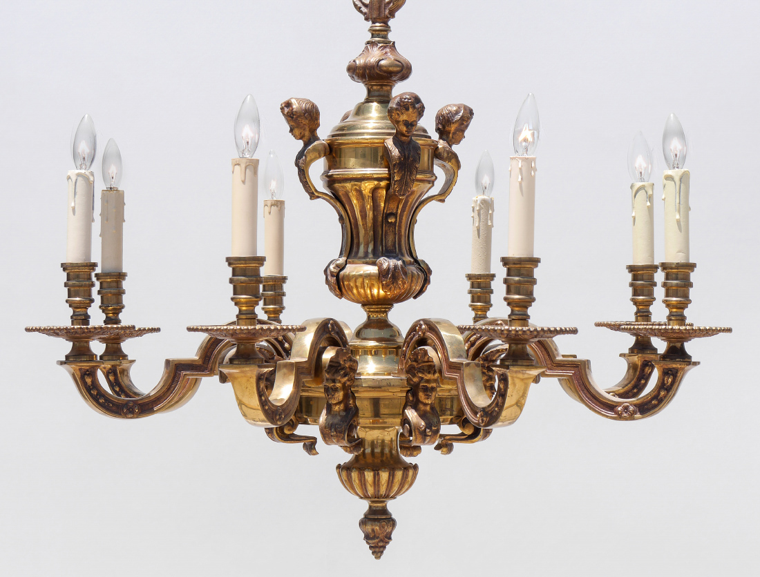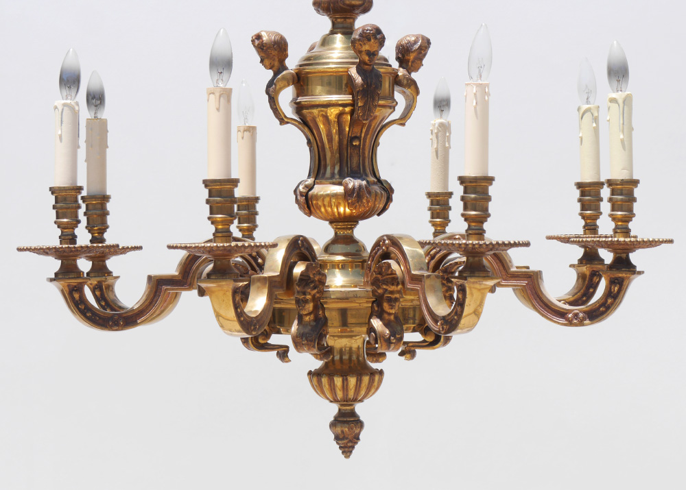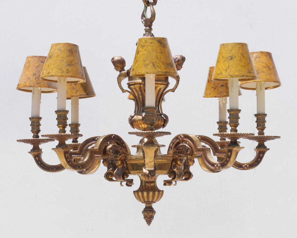 8 ARM BRONZE FIGURAL PUTTI CHANDELIER: 8 arm brass and gilt bronze with 4 figural putti busts and 8 figural maiden bust under each arm. Approx. 26'' x 32''. Sold with cloth shades.