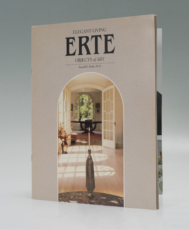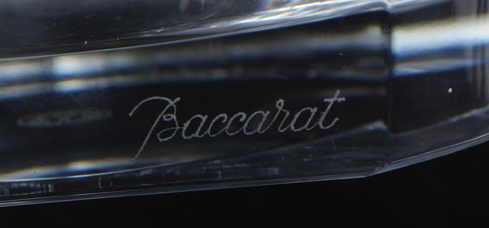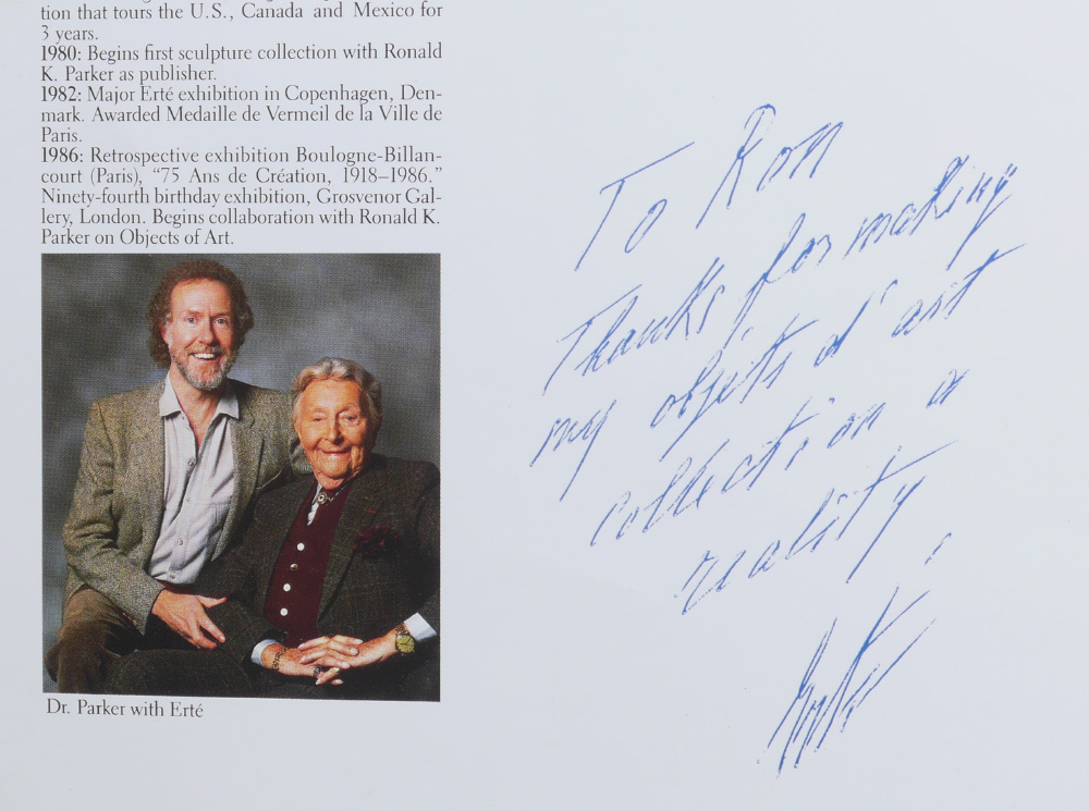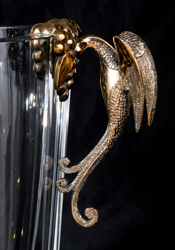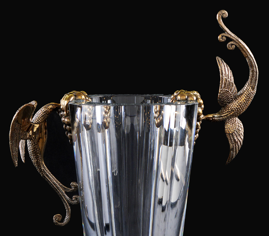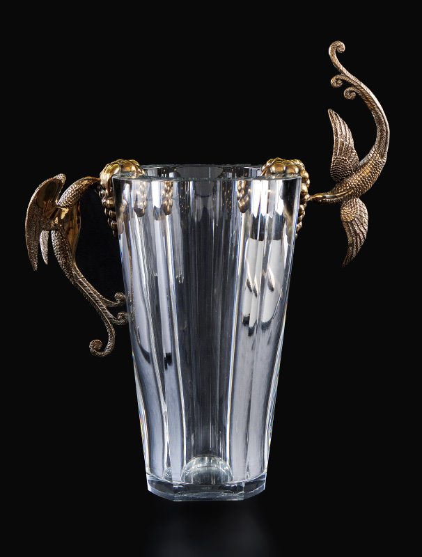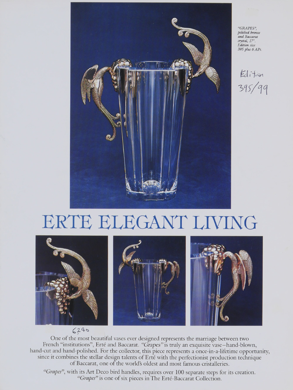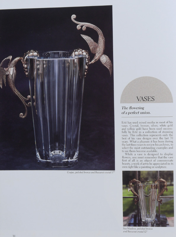 ERTE ''GRAPES'' BACCARAT CRYSTAL VASE: Designed by the artist Erte in conjunction with Baccarat crystal and retailed by the Dyansen Gallery. Titled ''Grapes'', aka ''Flight of Love'', it features fine gilt bronze art deco birds feeding on grapes mounted on hand blown & polished signed Baccarat crystal vase, numbered limited edition #99/395. Sold with ''Grapes'' detail page and an original Dyansen / Sevenarts catalog signed and dedicated by Erte. 16 3/8'' h. x 13'' x 6 1/2''.