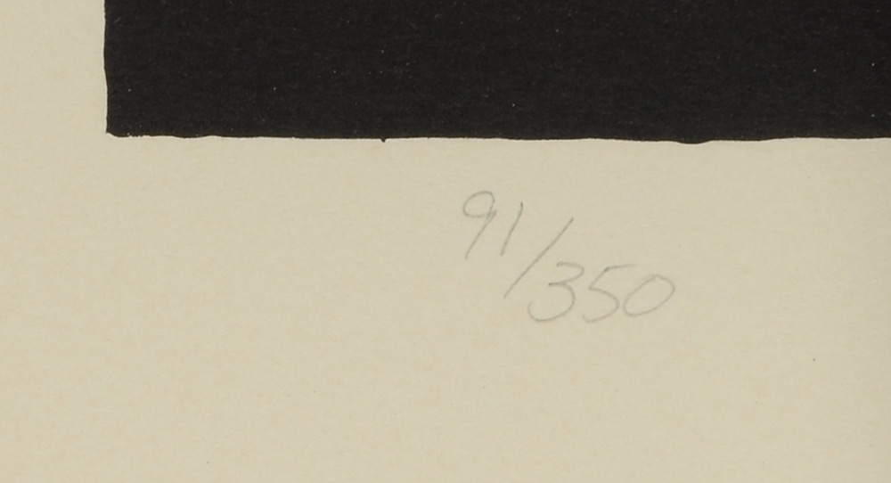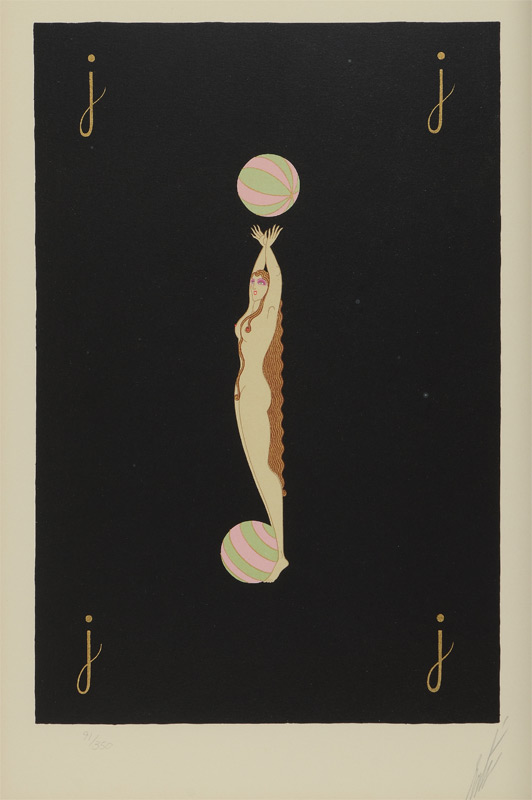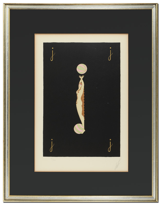 ERTE ALPHABET LETTER J LITHOGRAPH: From the ''Alphabet'' Series, signed lower right, numbered 91/350. Sight size 19'' x 12 3/4'', framed 27 1/2'' x 21''. Sold with pamphlet and original purchase check for $1,564 in 1982 from William Crawford Plumley Estate.
