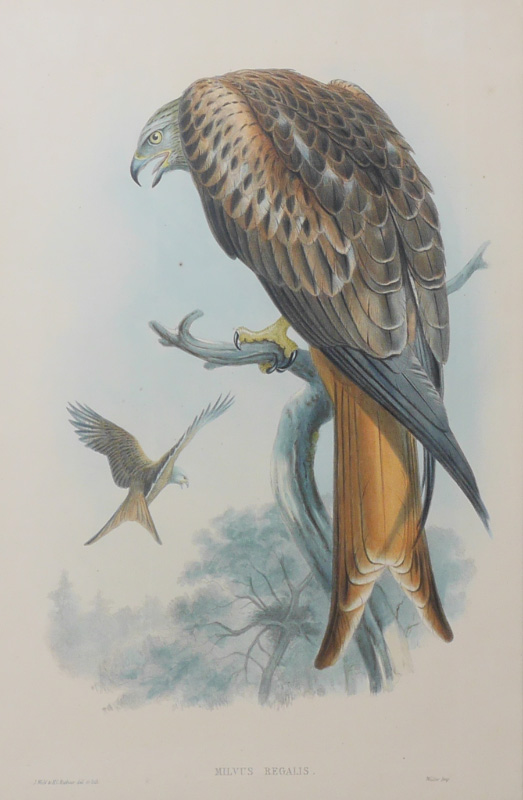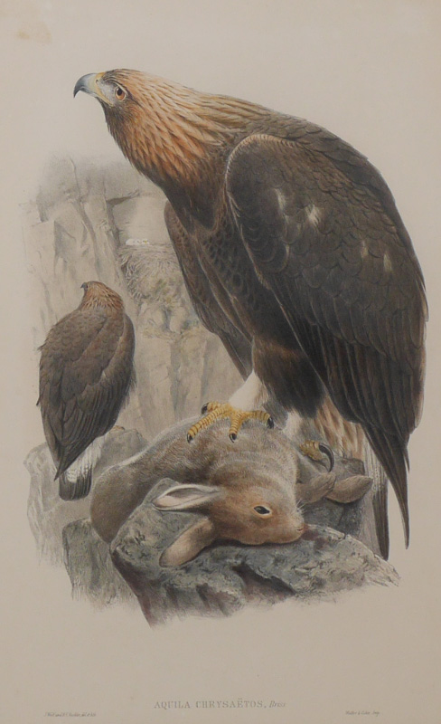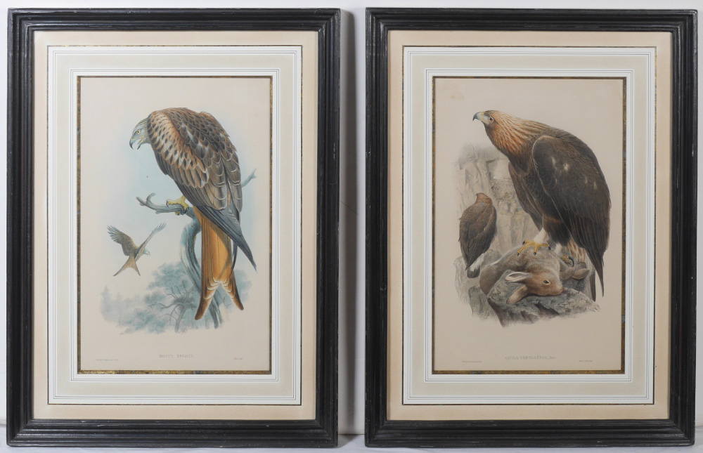 PAIR OF PERIOD GOULD BIRD PRINTS: 2 Hand Colored Lithographs to include 1) Milvus Regalis, sight size 20'' x 13 1/2'', framed, 30 1/2'' x 23 3/4''; 2) Aquila Chrysaetos, sight size 20'' x 13 1/2'', framed, 30 1/2'' x 23 3/4''.