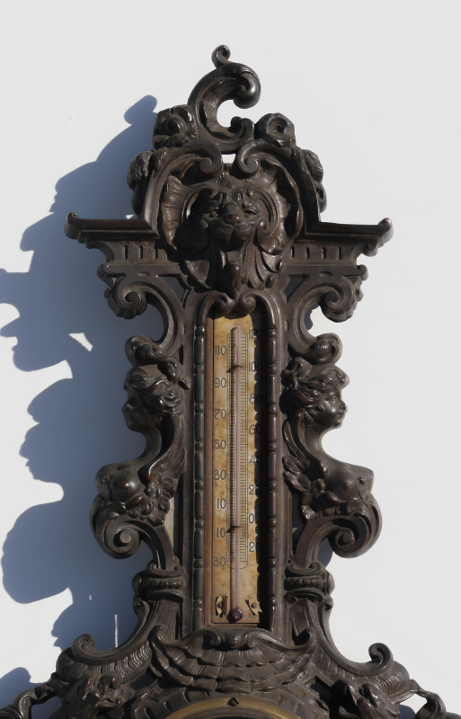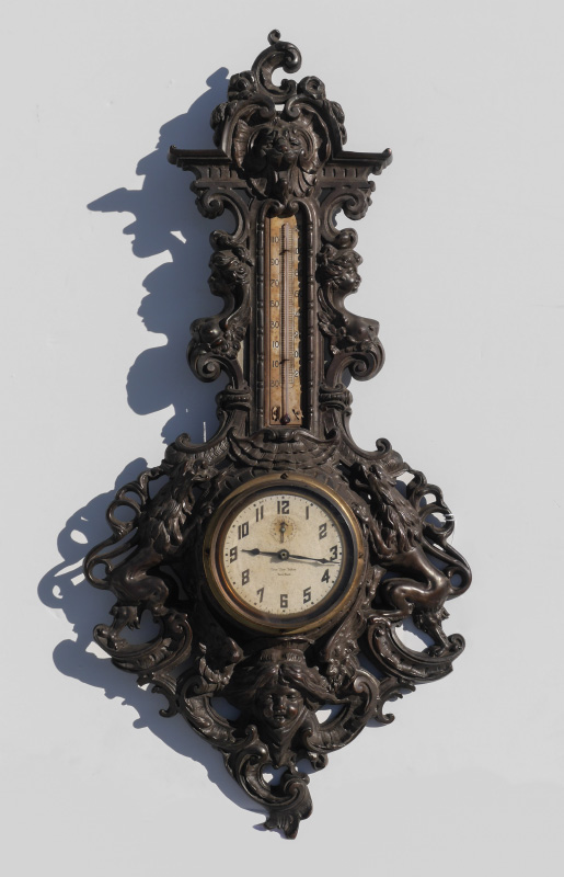 NEW HAVEN CAST IRON CLOCK & THERMOMETER: Pediment with lion masqueron, figural maidens on neck, Rampant lions on body, putti masqueron lower with foliate scroll all over. Thermometer on neck, round clock in body, paper dial marked The New Haven Clock Co. 29 1/2'' h. x 14 1/4'' x 2 1/4''.