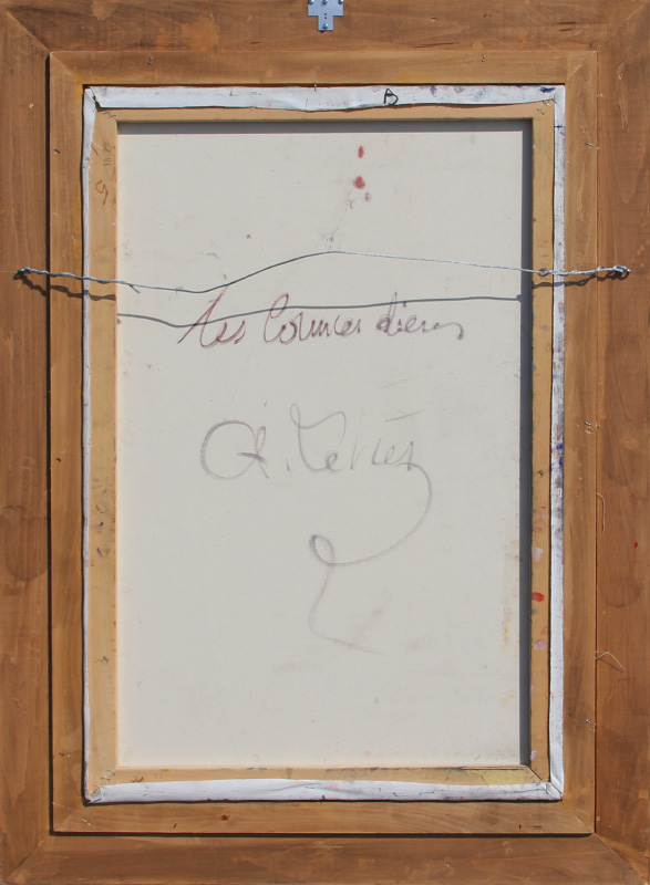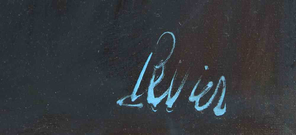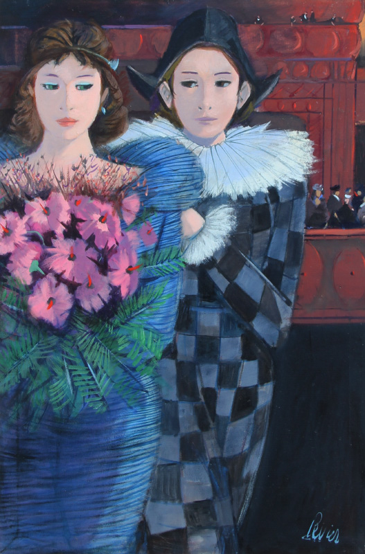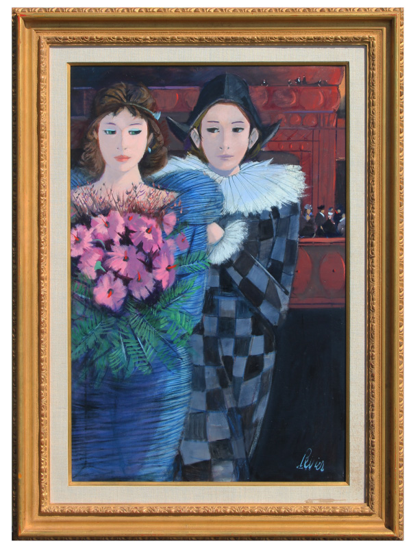 LEVIER, Charles, (French, 1920-2003): Harlequin and Young Beauty After the Performance, Oil/Canvas, 36'' x 24'', signed lower right, signed and titled in French verso, heavy contemporary gilded frame, 45'' x 33''.