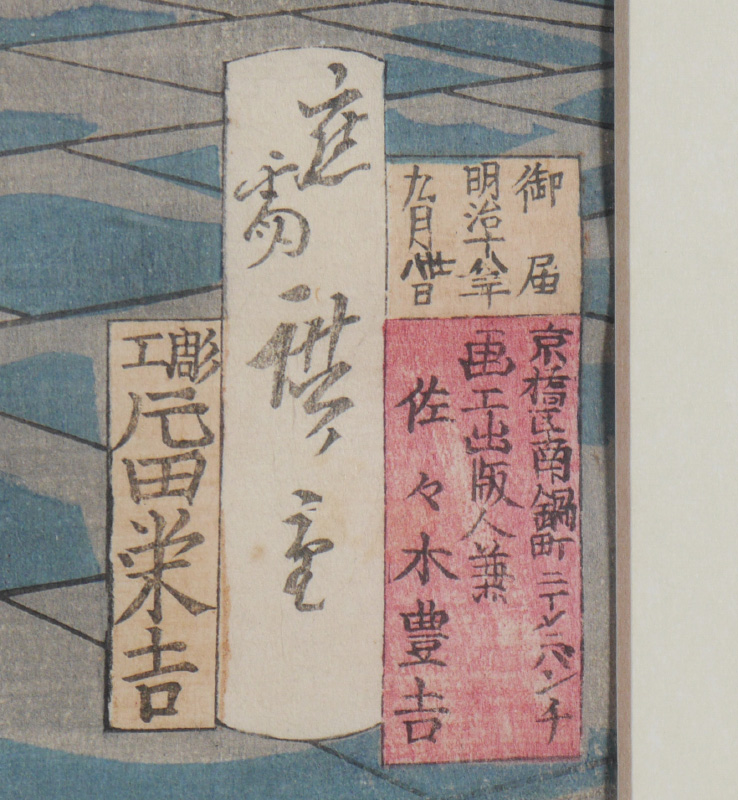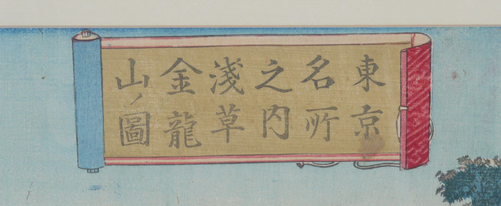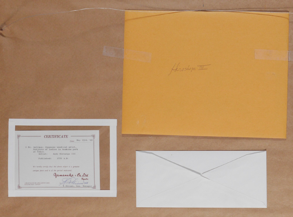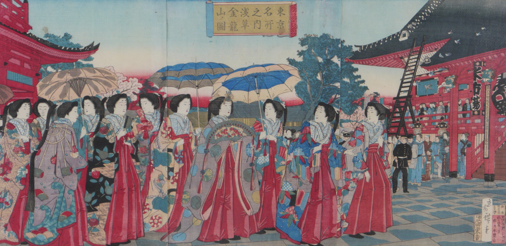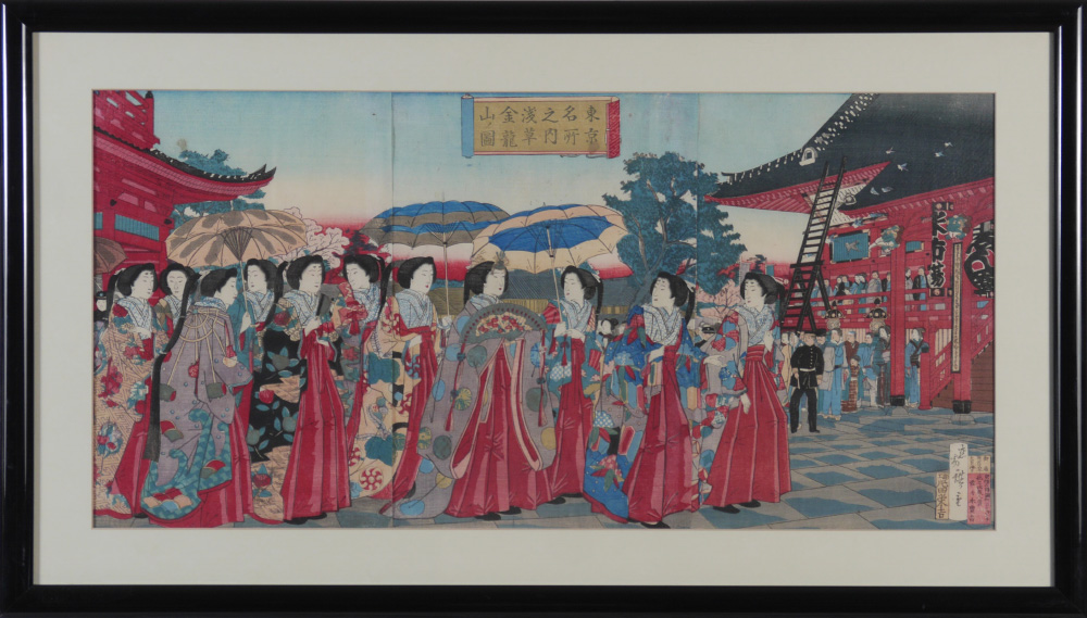 HIROSHIGE, Ando, (Japanese, 1797-1858): Ladies in Asakusa Park at Tokyo, Japanese Woodblock Triptych, sight size 13 1/2'' x 27 3/4'', custom lacquer frame, 19 1/2'' x 33 1/2'', Yamanaka label affixed verso.
