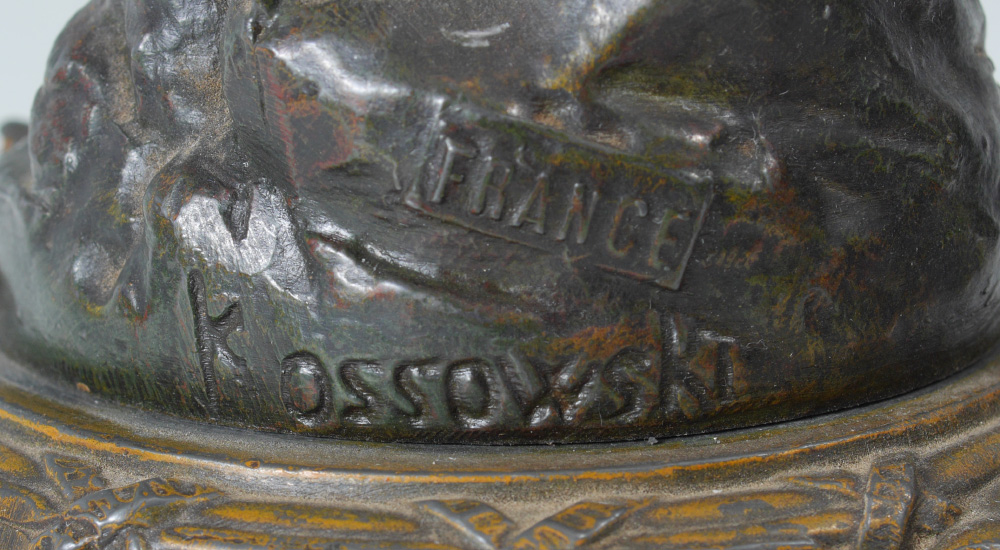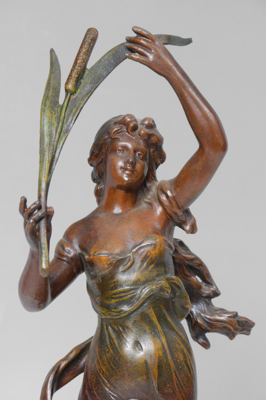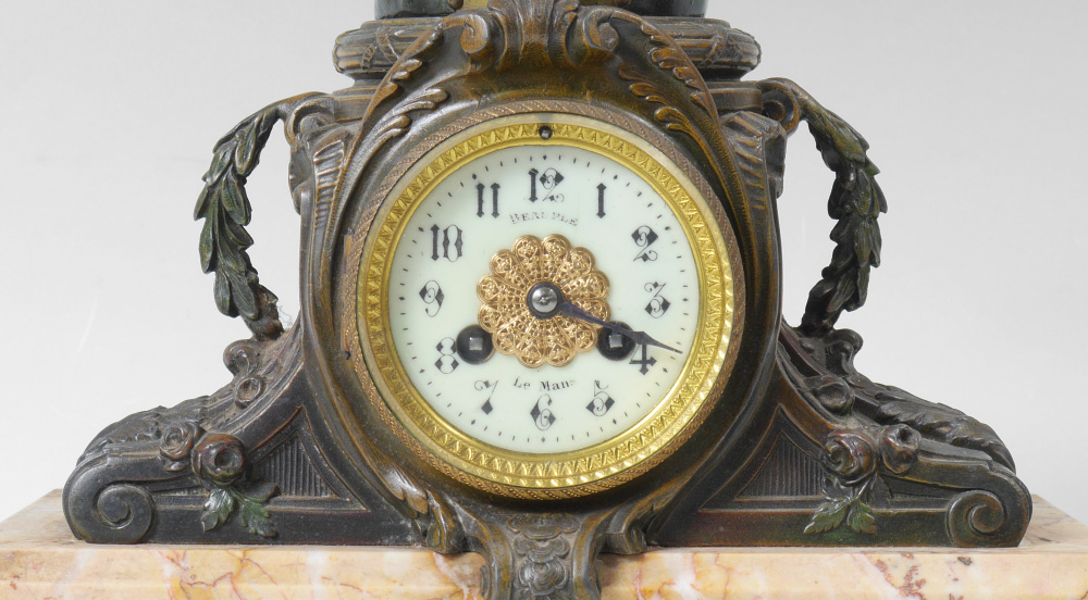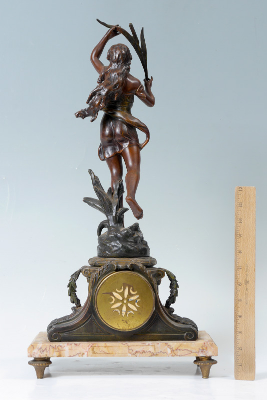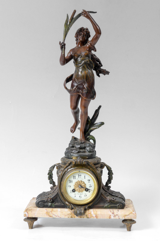 FRENCH NAIADE FIGURAL MANTLE CLOCK: Top with patinated metal figure of ''Naiade'' after Kossowski, ornate cast case, porcelain dial marked ''Beauple, Le Mans'', on marble base with 4 feet. Vincenti Et Cie time and strike movement, overall measures 23 1/4'' h. x 12'' x 5 1/2''.