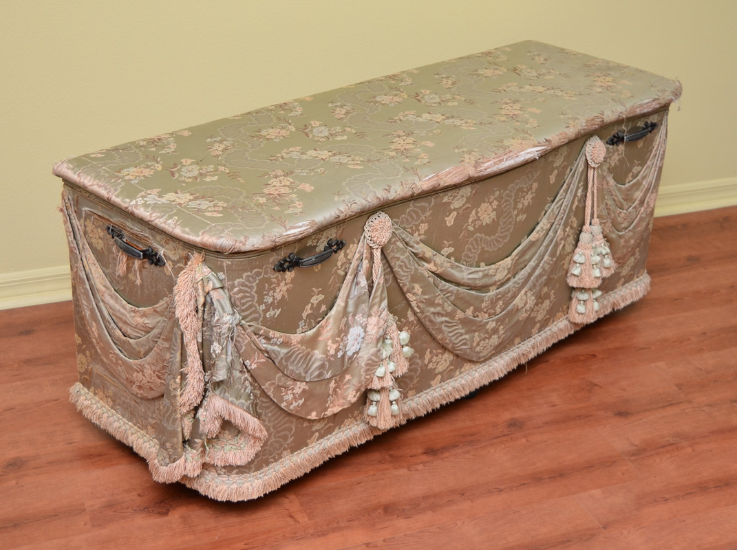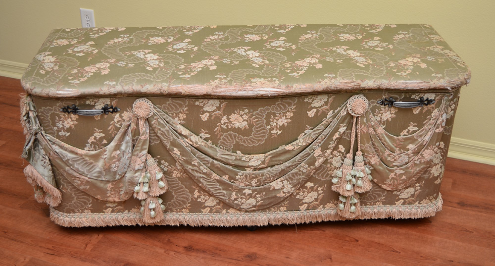 FRENCH STYLE UPHOLSTERED BLANKET CHEST: Hollywood Regency chest with floral upholstery on all sides, top also padded. Front and side with draped valences, front with applied handles, all on castors. Overall 23'' h. x 54'' x 20''.