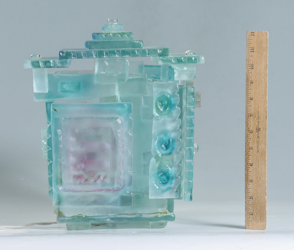 PELISH, Susan, (American, 20th Century): Welded frosted glass table lamp with hues of blue, green and pink. Single socket fixture. Overall 13'' h. x 11'' x 9 1/4''.