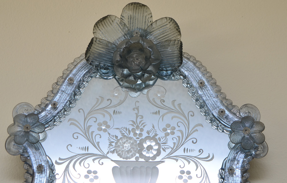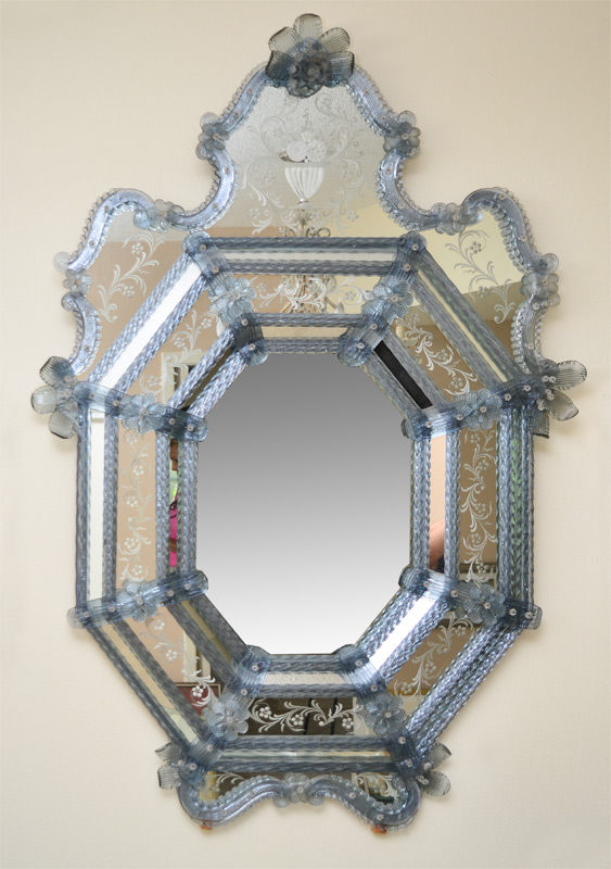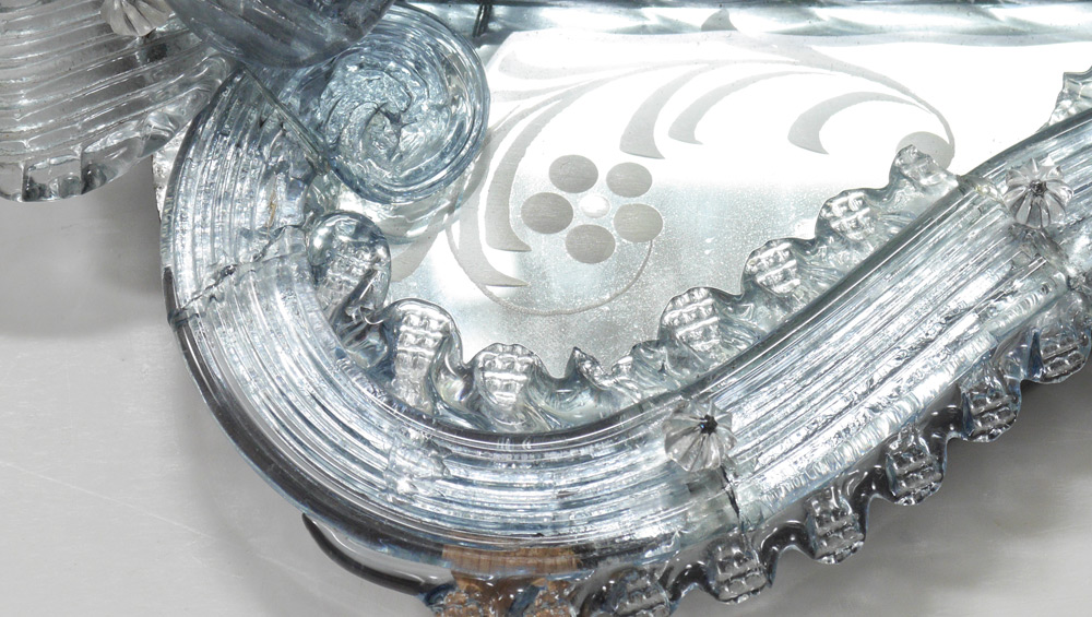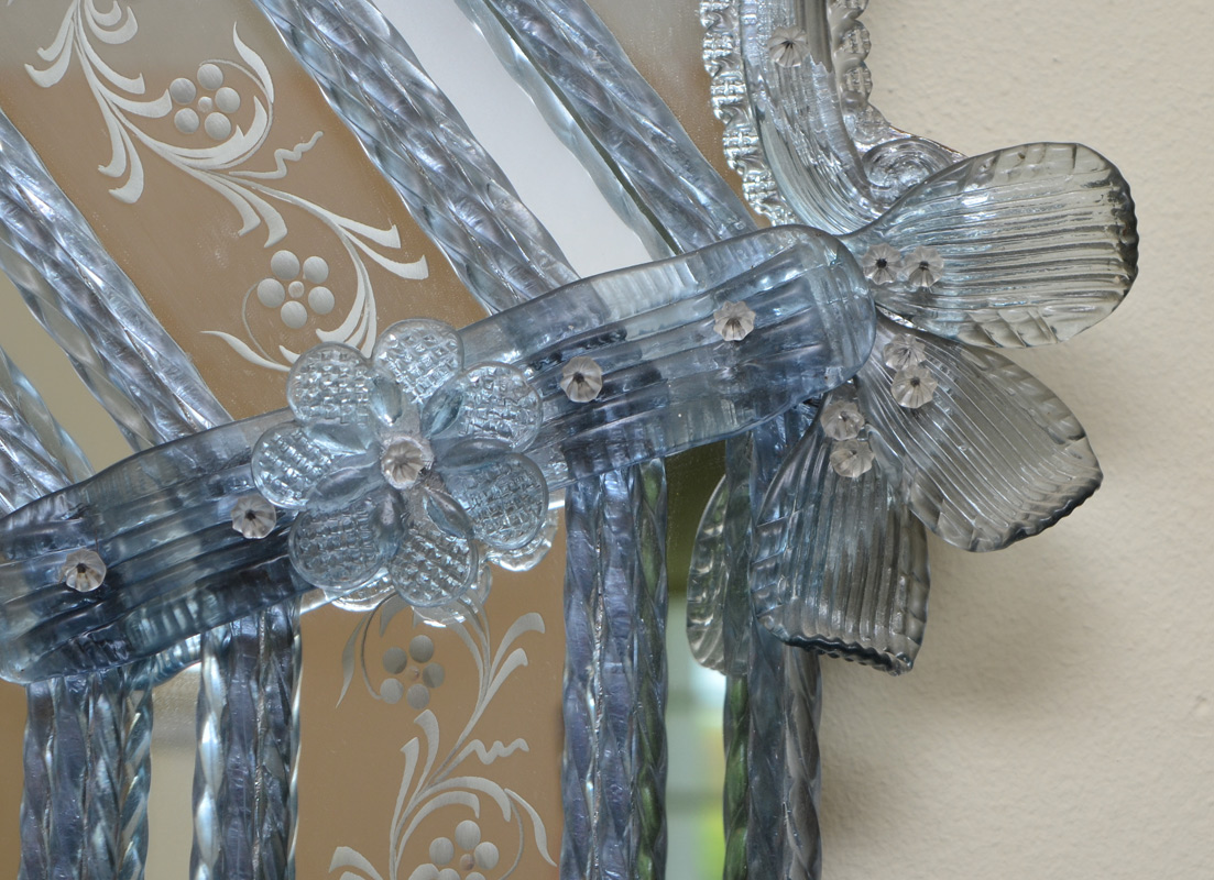 VENETIAN STYLE MIRROR: Shaped trim with rope twist and applied rosettes, etched glass panels. Overall measures 51'' h. x 33'' x 2 1/2''.