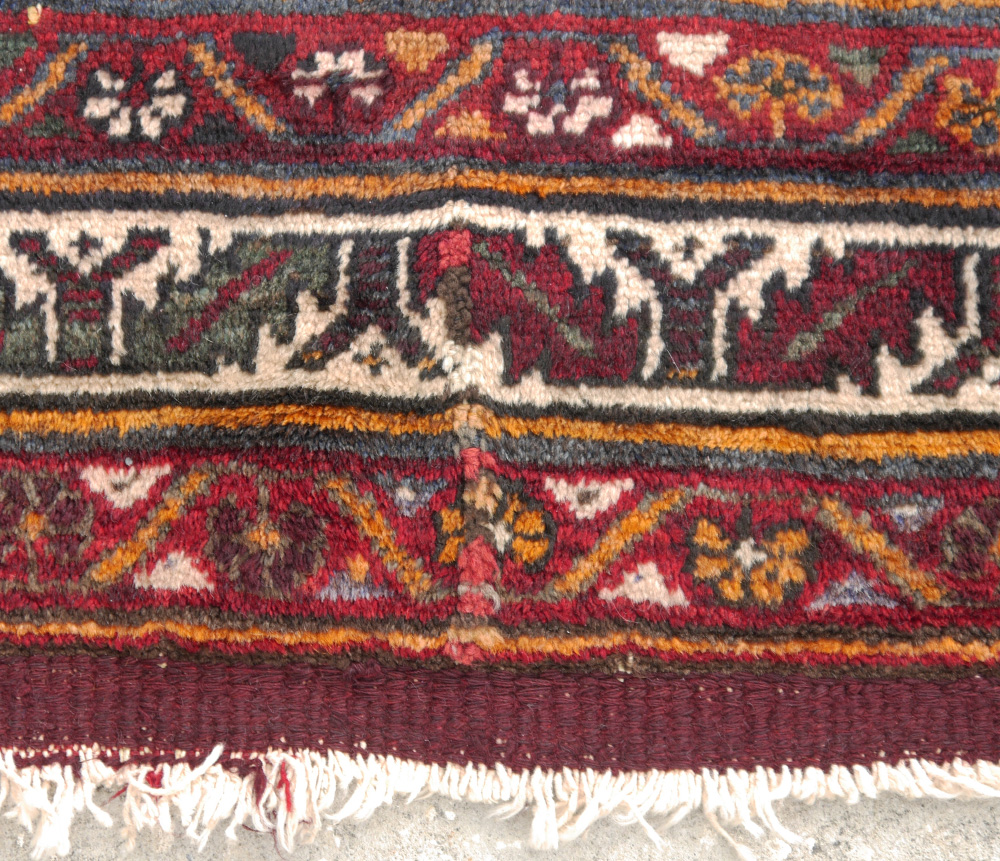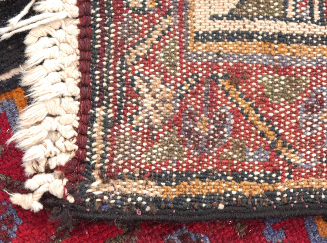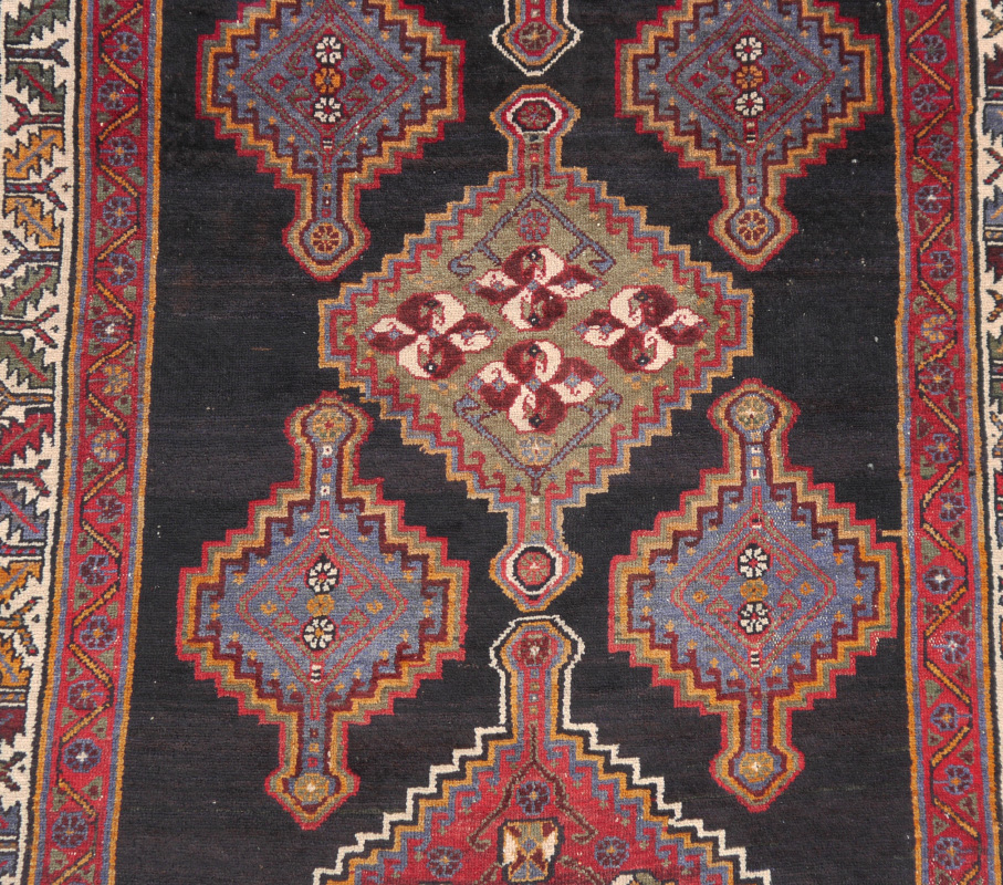 SEMI-ANTIQUE NW PERSIAN HAND KNOTTED WOOL RUG, 4'9'' x 7'8'': This rug has a somewhat unusual black background in the field that makes the design elements really stand out. There are three central serrated edge diamond shaped medallions that run down the center of the field. On either side are found smaller similar medallions. Each of the medallions have various colors and inner motifs. The most interesting are the pinwheel motifs found in the central medallions. They are, like the serrated leaf and wine glass border, found in Caucasian rugs. This may be a Kurdish rug because they often take elements from rugs woven by other neighboring weavers.