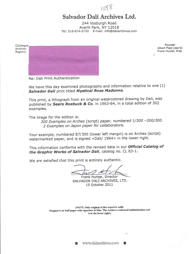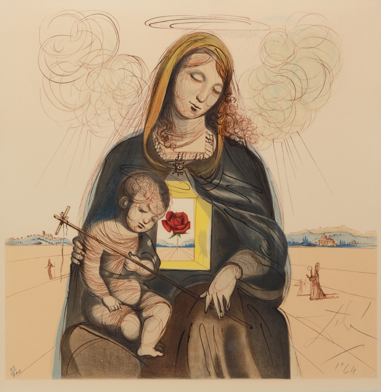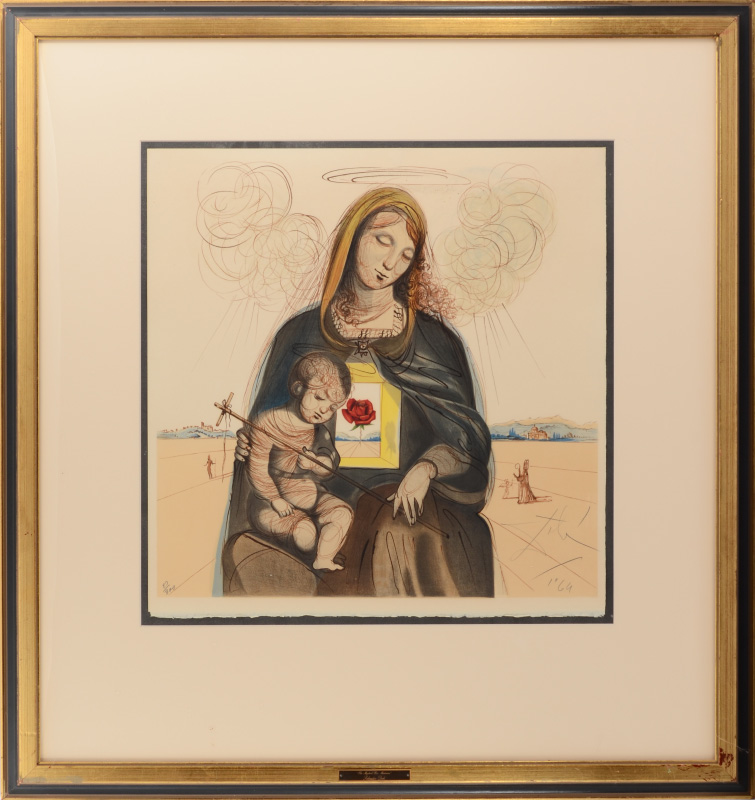 DALI, Salvador, (Spanish, 1904-1989): ''Mystical Rose Madonna'', Lithograph, sight size 19 1/4'' x 18 3/4'', pencil signed lower right and dated 1969, numbered 87 of 300 lower left, float mounted and framed, 33 1/2'' x 31 1/4''. Accompanied by Letter of Authenticity from Salvador Dali Archives, Ltd.