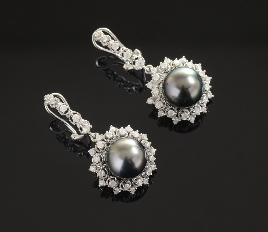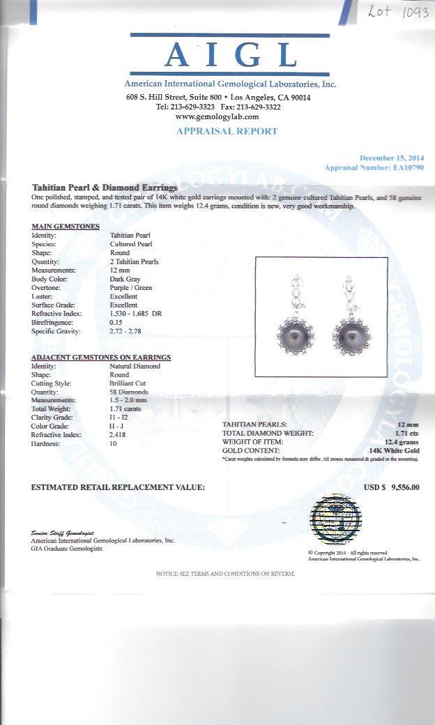 TAHITIAN PEARL AND DIAMOND EARRINGS: 14K white gold earrings with 2 cultured Tahitian pearls, 12mm, dark gray in color with purple green overtone having an excellent luster. The 58 round brilliant diamonds total approx. 1.71 Ct., averaging I1-I2 in clarity and H-J color. Hinged post closure. Length 1.5''. Weight 12.4 grams. Sold with current AIGL GIA graduate's appraisal for $9556.