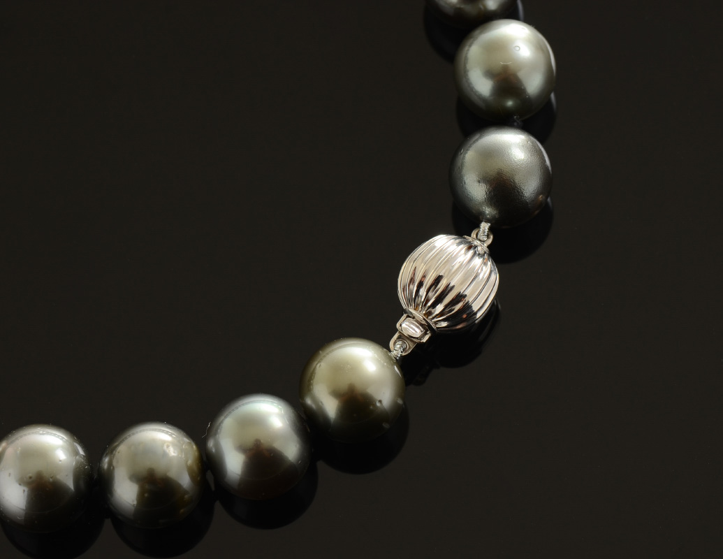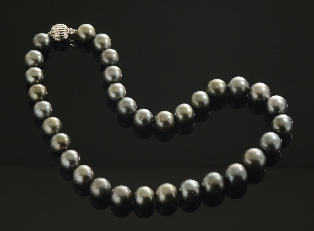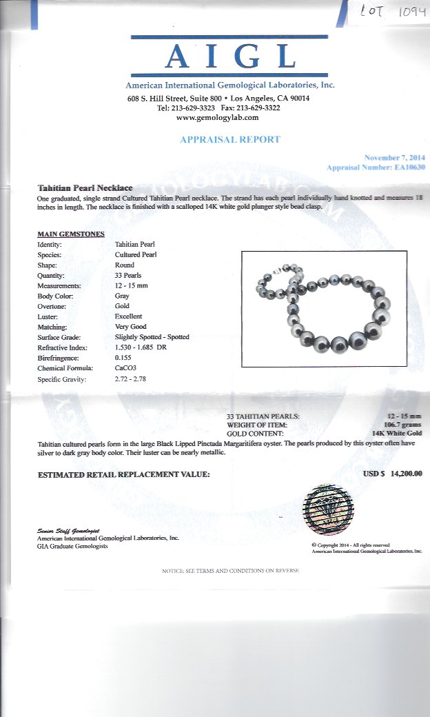TAHITIAN PEARL NECKLACE: Strand necklace of 33 Tahitian pearls graduating in size from 12-15 mm. Silver gray in color. Good luster, spotted surfaces. Scalloped 14K white gold clasp. Length 18''. Weight of necklace. 106.7 grams. Sold with current AIGL GIA graduate's appraisal for $12,400.