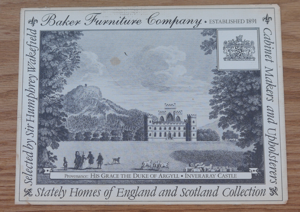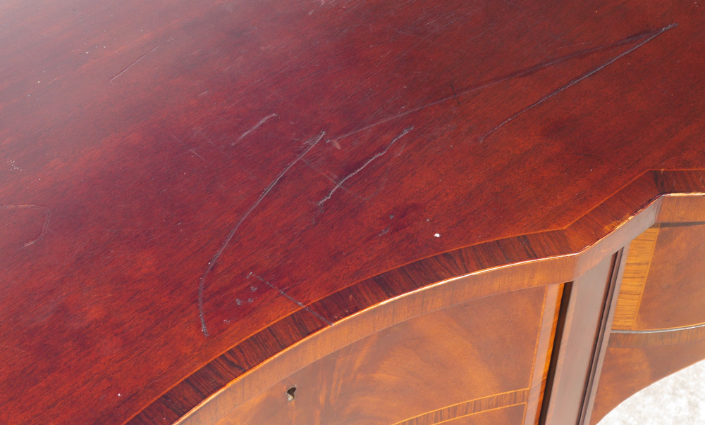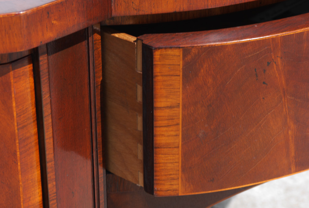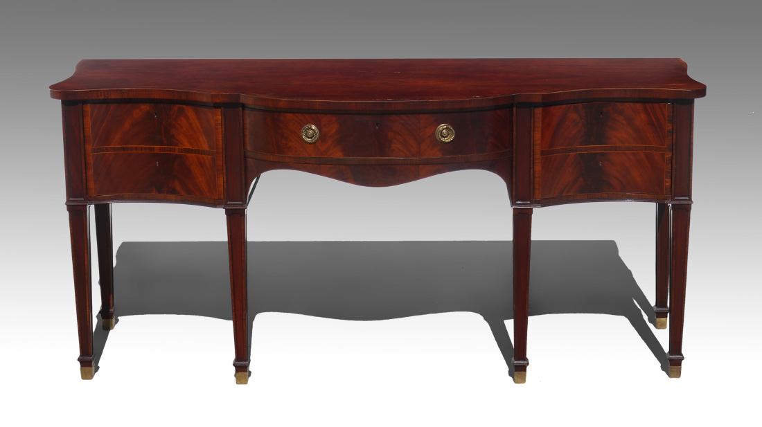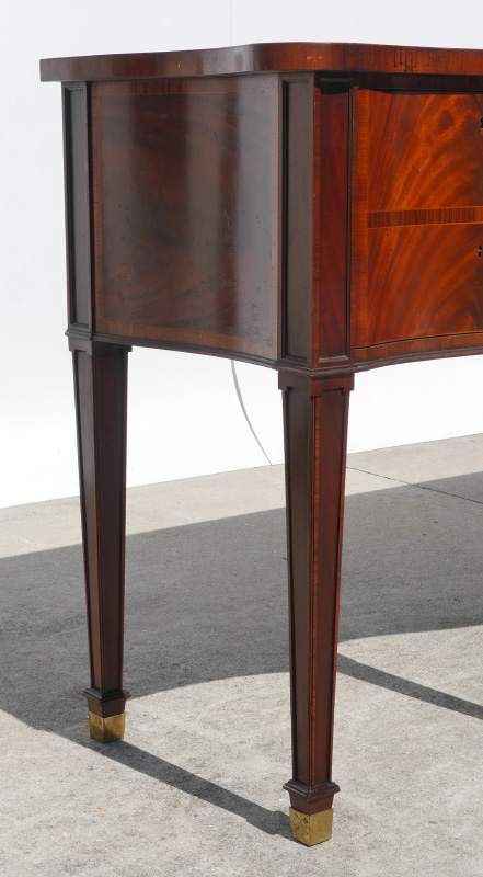 BAKER STATELY HOMES COLLECTION SIDEBOARD: Shaped banded mahogany top with string inlay, single central drawer with single deep drawer either side, tapered legs. Center drawer with paper label ''Stately Homes of England & Scotland Collection'', Inveraray Collection. Overall measures 35 1/2'' h. x 75 3/4'' x 25 1/4''.