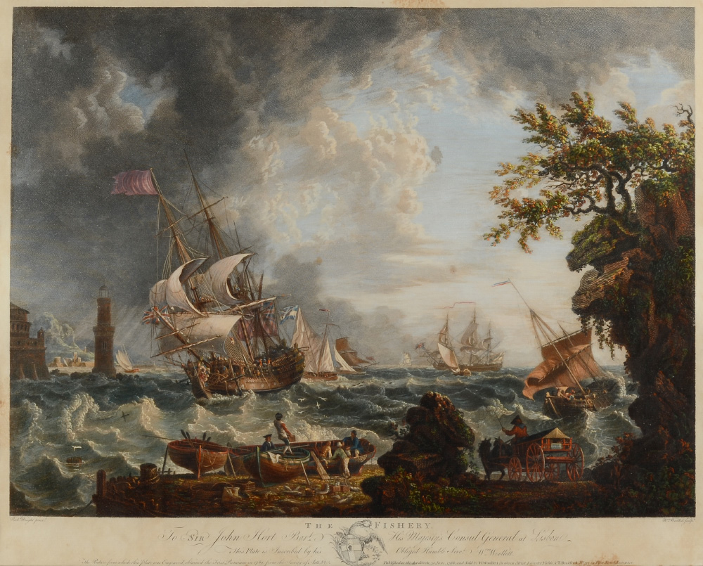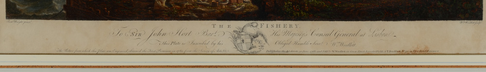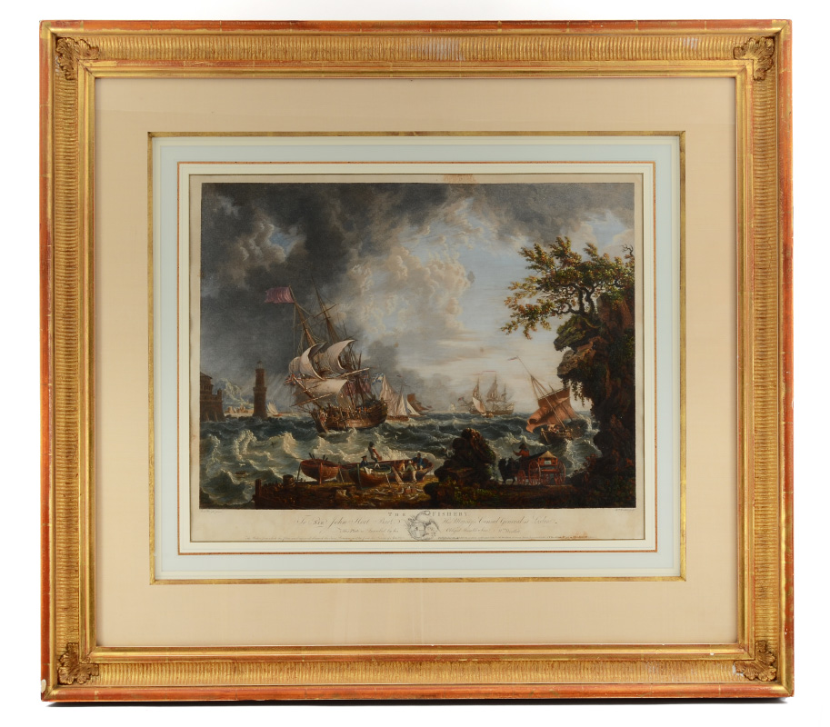 'THE FISHERY'' PERIOD ENGRAVING BY WOOLLETT: Fine Period Color Engraving, sight size 17 1/2'' x 21'', Donald A. Heald heavy gilded gesso frame, 32'' x 35'', label affixed verso Artwork for Ritz-Carlton Amelia Island.