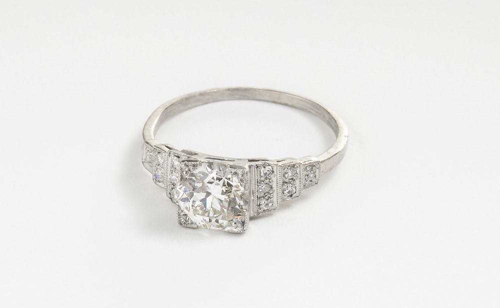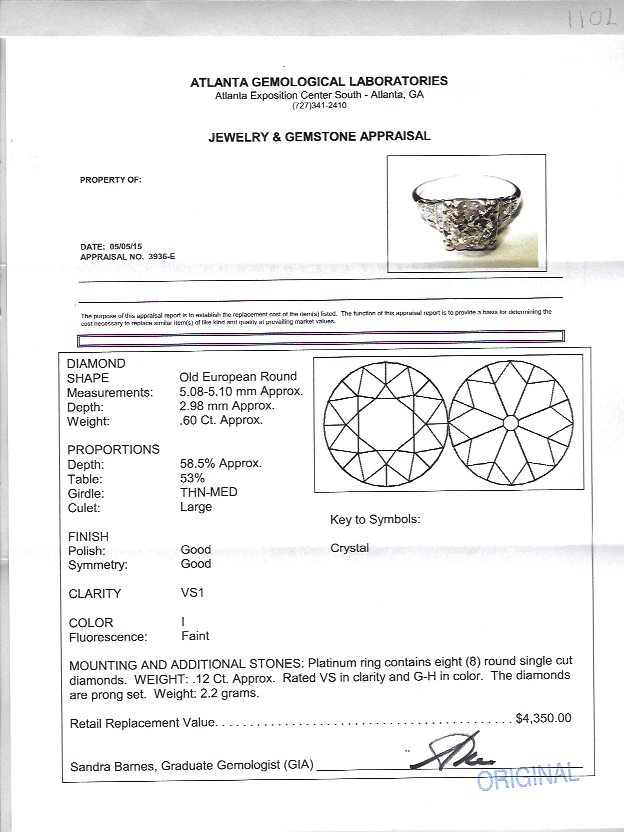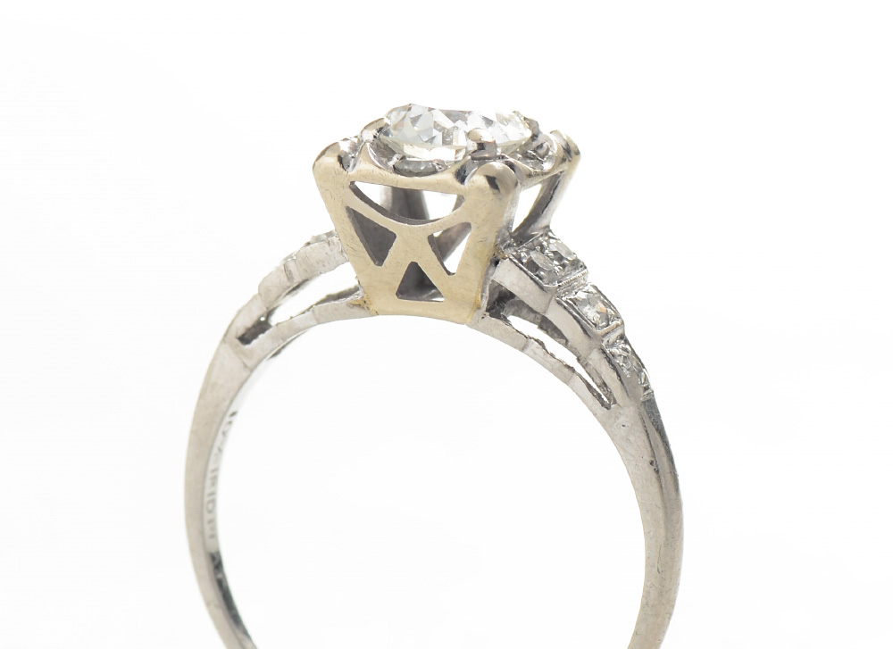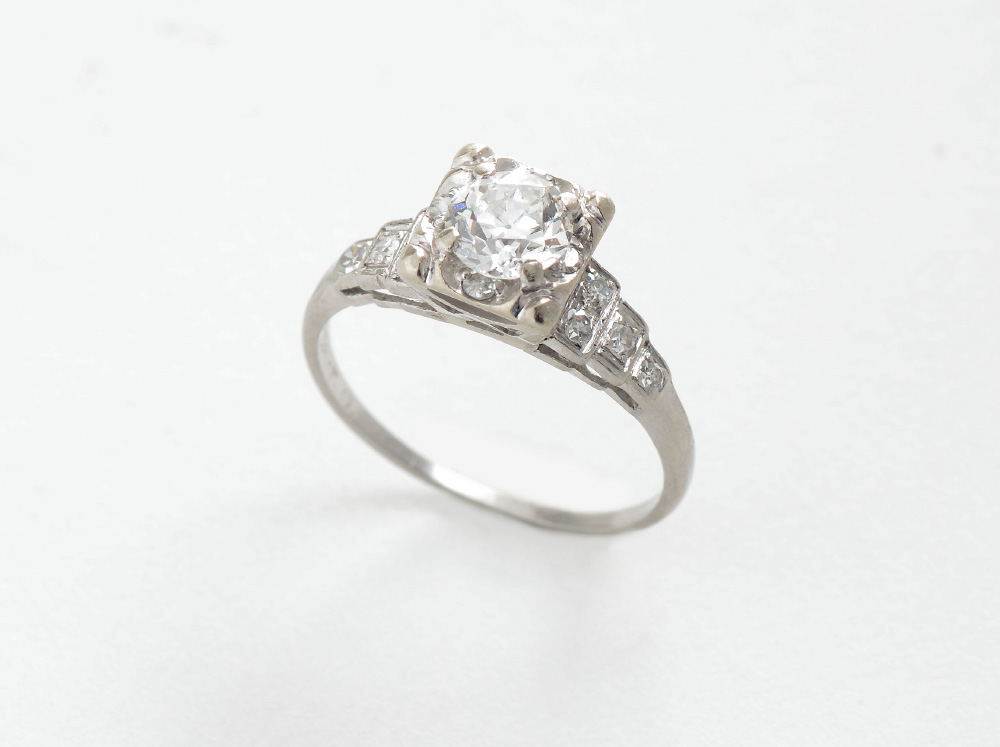 ART DECO PLATINUM DIAMOND ENGAGEMENT RING: Centering an approx. .60 Ct Old European round cut diamond of VS1 clarity and I color. Stepped shoulders have 8 diamonds totaling .12 Ct., VS clarity and G-H color. Size 4.5. Weight 2.2 grams. Sold with current Atlanta Gemological GIA graduate's appraisal for $4350.