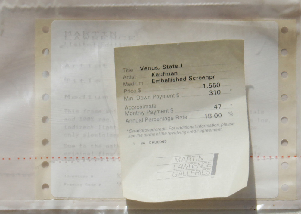 KAUFMAN, Steve, (American, 1960-2010): ''Venus, State I'', Embellished Screenprint/Canvas, sight size 44'' x 30'', signed on the canvas verso, framed, 45'' x 32''. Sold with Martin Lawrence Limited Editions label and sticker.