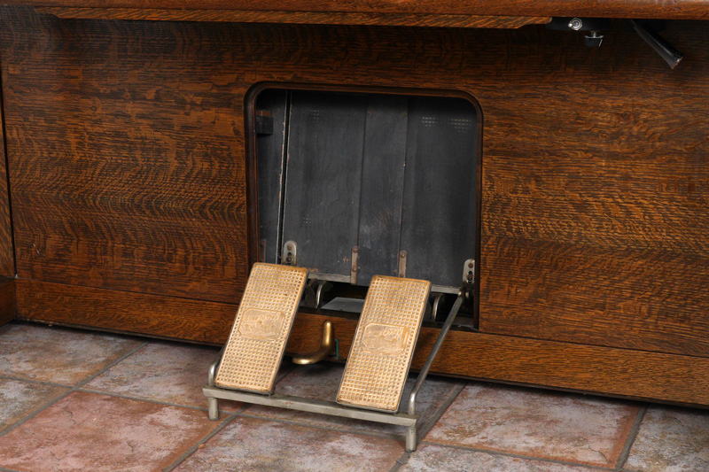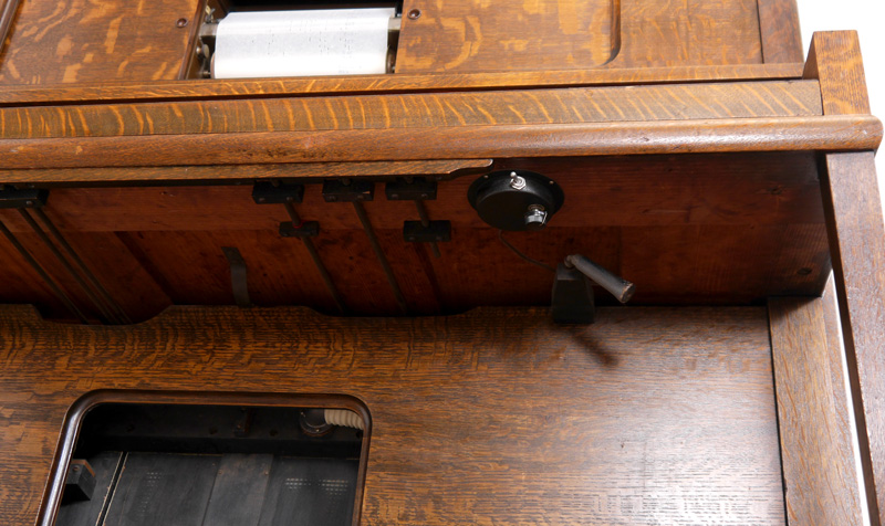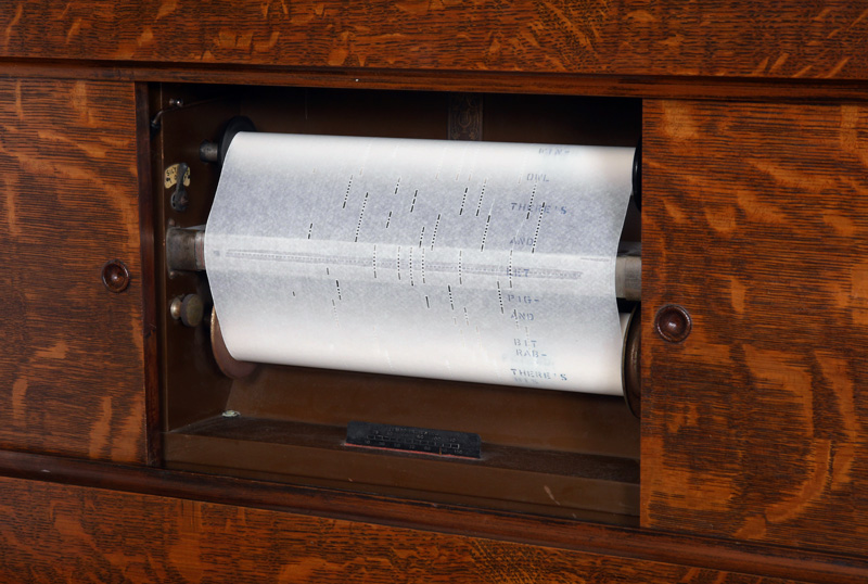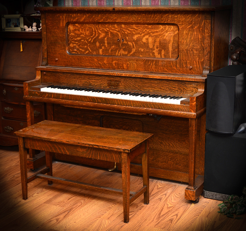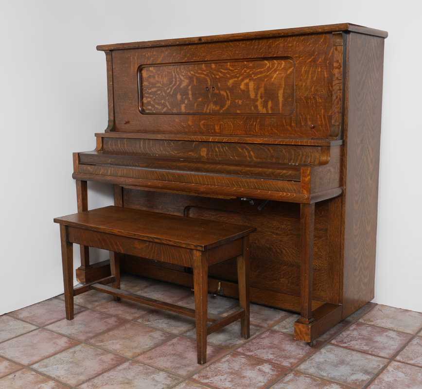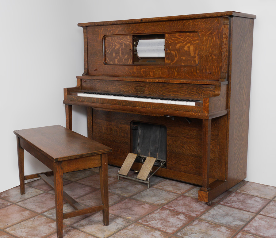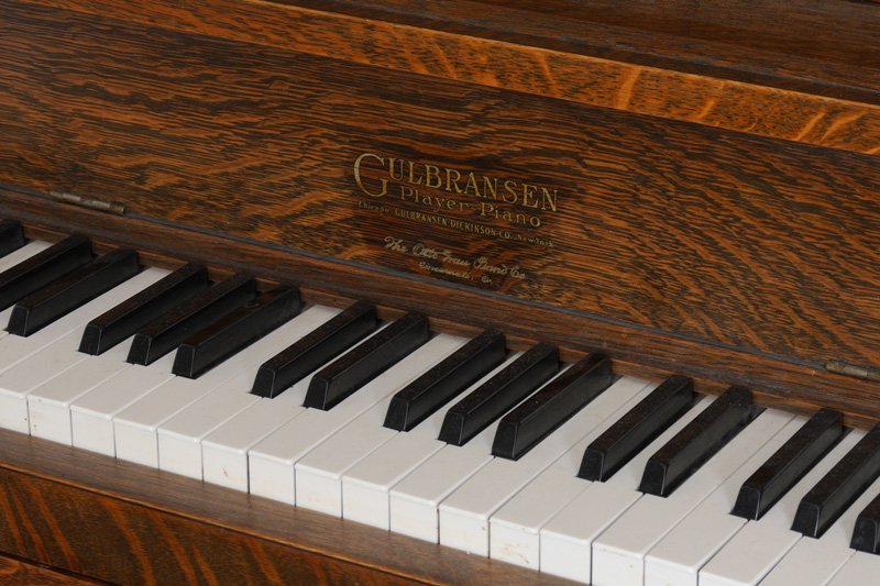GULBRANSEN DICKENSON GOLDEN TIGER OAK UPRIGHT PLAYER PIANO: No reserve on this beautiful early 20th century (Ca 1921) pump and electric player piano by Gulbransen with striking, highly grained quarter sawn oak case and ivory appearance keys. Plays 11'' paper rolls. Serial number 157104. Measures 55 1/4'' x 63'' x 28''. Sold with piano bench and an approximately 24 piano rolls, 21'' h. 37'' x 15''. Axel Gulbransen founded the Gulbransen Piano Company in Chicago in 1904 and by 1917 had grown to be the world's largest manufacturer of player pianos Gulbransen claimed that their player pianos were the easiest to pump in the industry, so easy, a baby could do it!