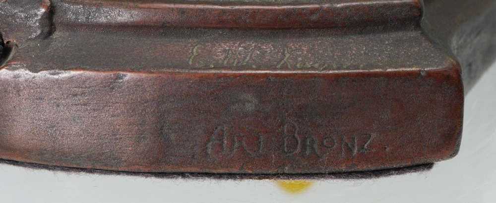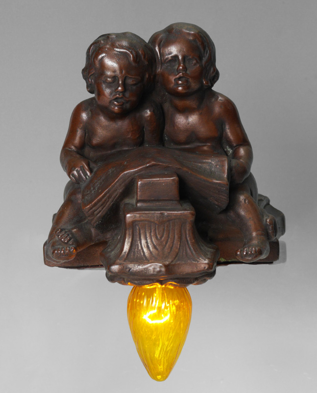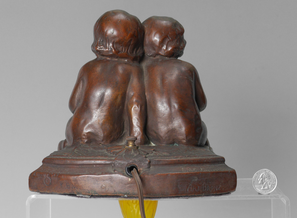 COPPER CLAD FIGURAL CHILDREN PIANO LAMP: Figures of 2 children looking at a papers, signed E. W. Xavier, marked ''Art Bronz'', copyright K. B. W.. Holds single light over piano keys, 7'' h. x 8'' x 9 3/4''.