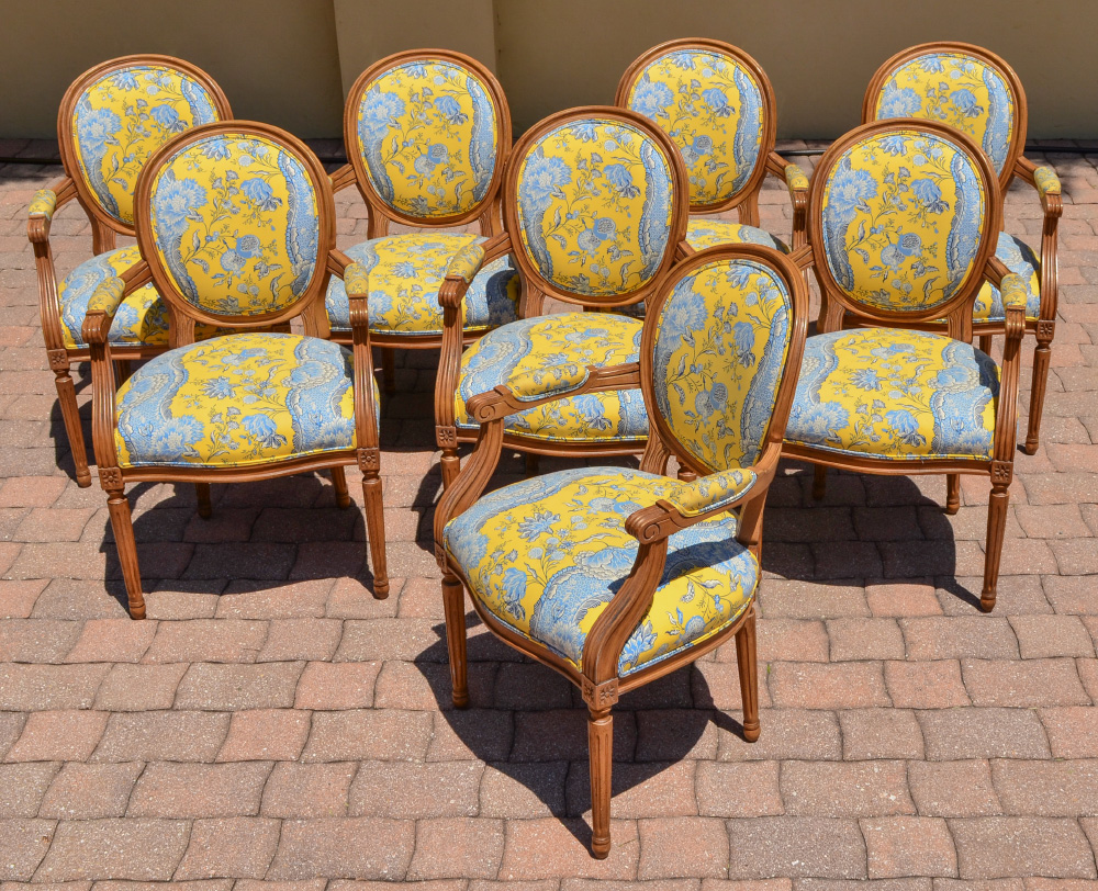 SET OF 8 LOUIS XVI STYLE ARM CHAIRS: Shaped medallion back, fluted hand holds and arm supports. Shaped skirt, tapered and fluted legs. Yellow and blue floral upholstery, 37 1/2'' h. x 23 1/4'' x 25''.