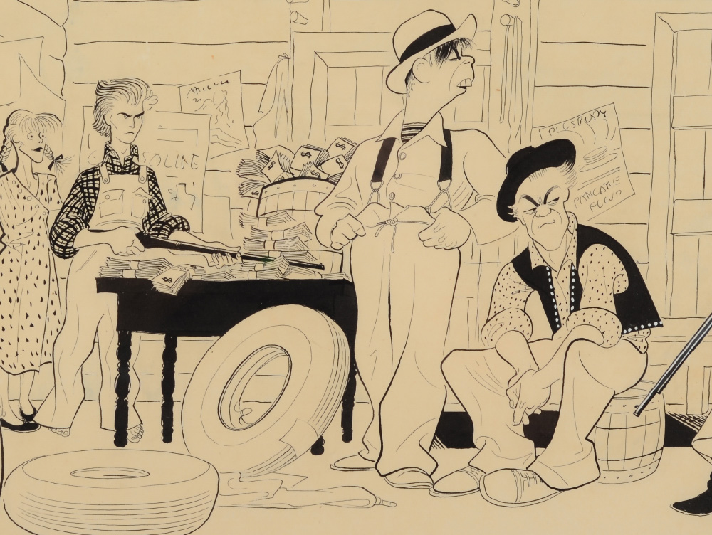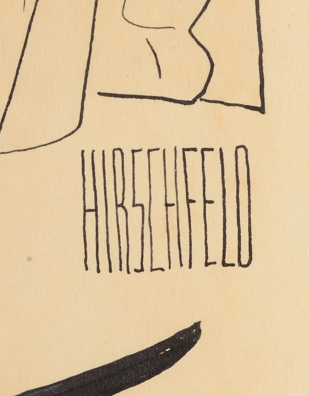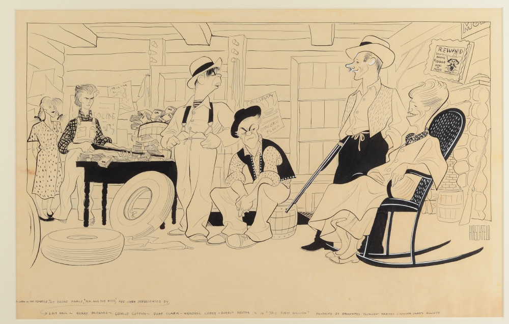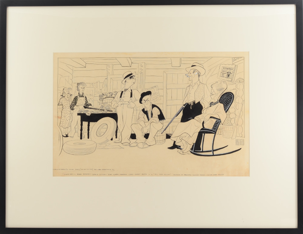 HIRSCHFELD, Albert, (American, 1903-2003): ''The First Million'', Pen/Ink, sight size 15 1/2'' x 23 3/4'', signed lower right, inscription in the lower portion reads ''A Cabin in the Ozarks and the Boone Family, Ma and the Kids are Here Represented by Lois Hall, Henry Barnard, George Cotton, Dort Clark, Wendell Corey, Dorrit Kelton in ''The First Million'' Produced by Broadway's Youngest Maestro Master James Elliott'', contemporary frame, 29'' x 37 1/4''.