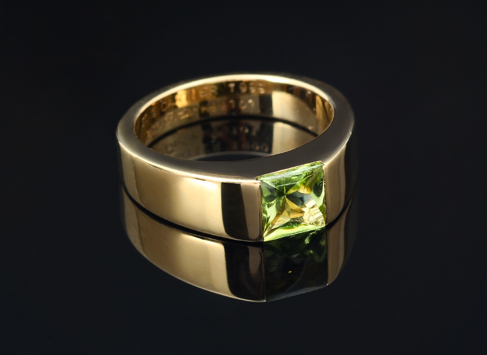 18K CARTIER PERIDOT TANK RING: 18K yellow gold ''Tank'' ring centers a single 5.50 x 5.50 mm buff top peridot. The peridot is channel set. Weight: 8.4 grams. Size: 5.25 Signed: Cartier.