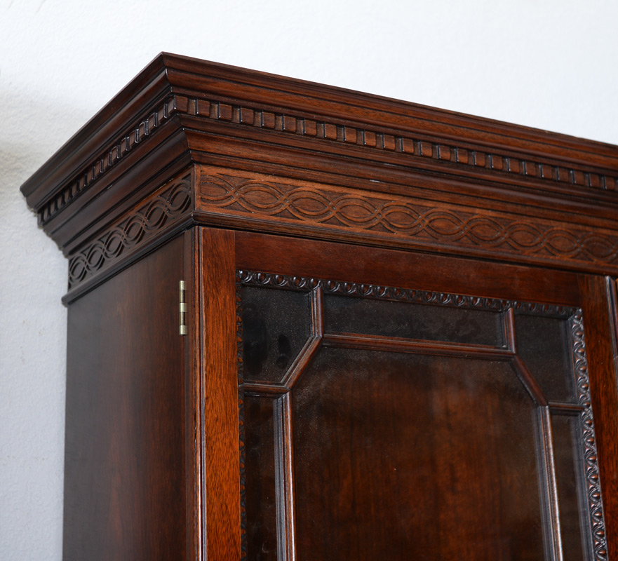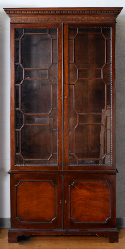 CHINESE CHIPPENDALE STYLE BREAKFRONT BOOKCASE: Mahogany bookcase, stepped pediment with dentil molding over carved decoration. Illuminated 2 glass doors with geometric fretwork over 2 blind doors, shaped feet. Overall measures 86 1/4'' h. x 45'' x 16''.