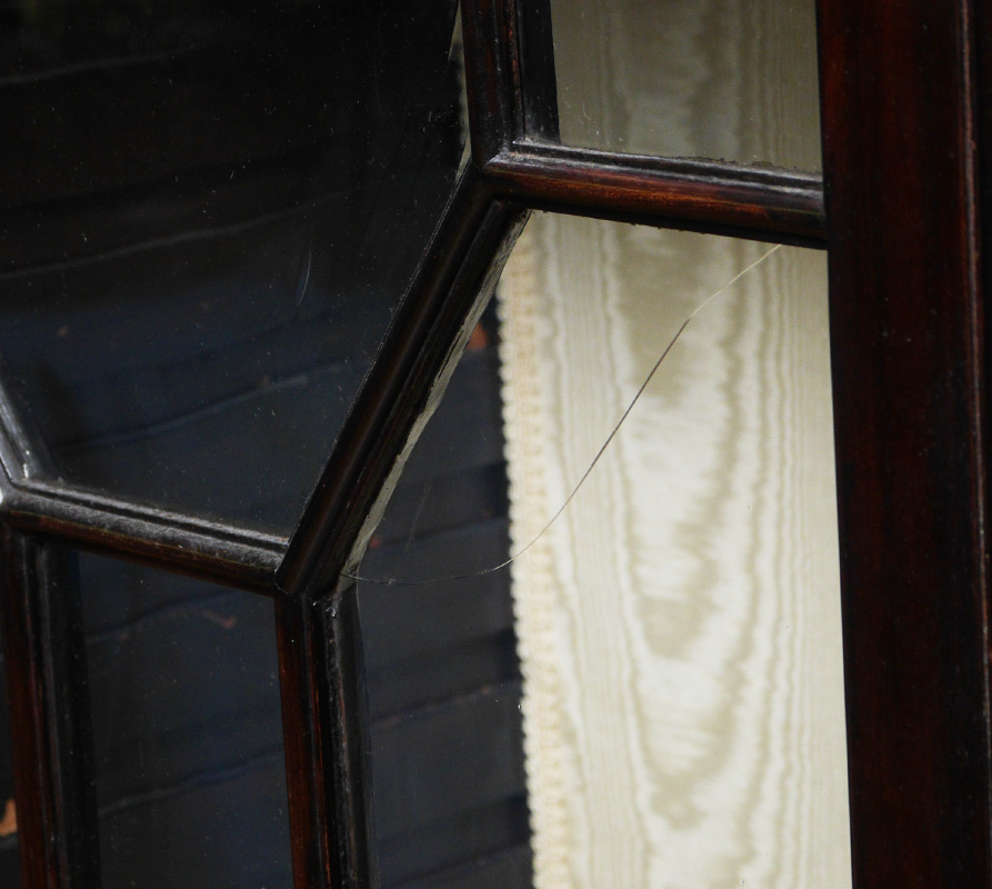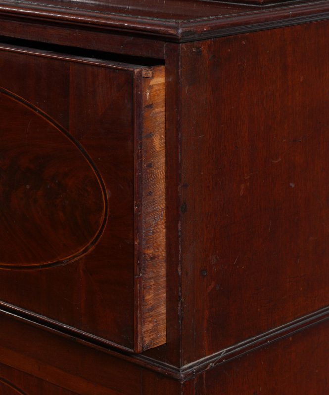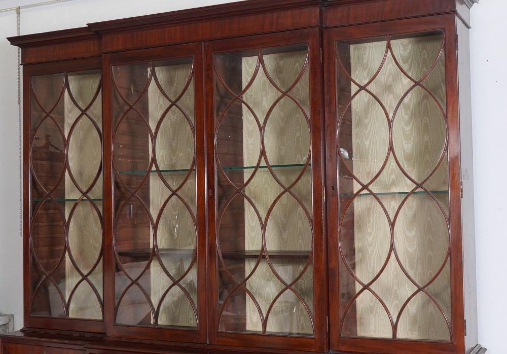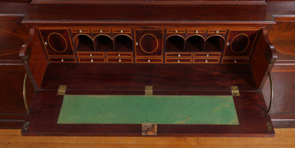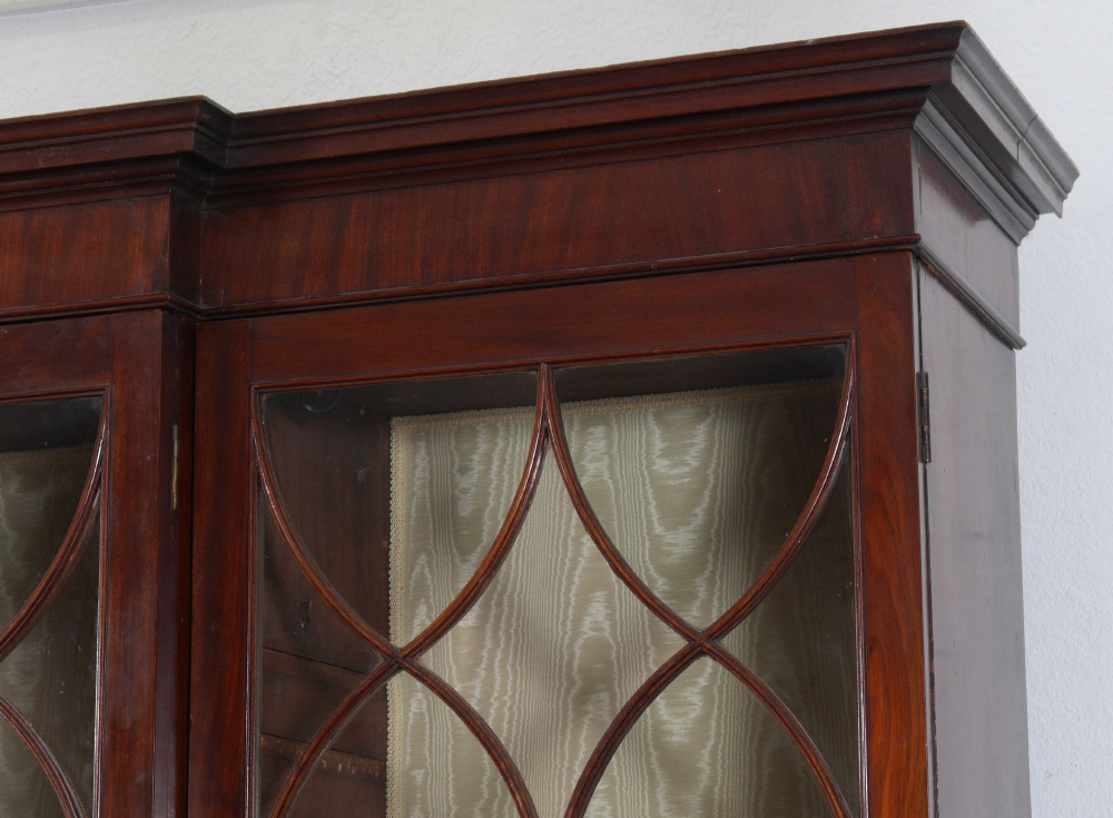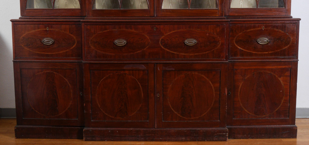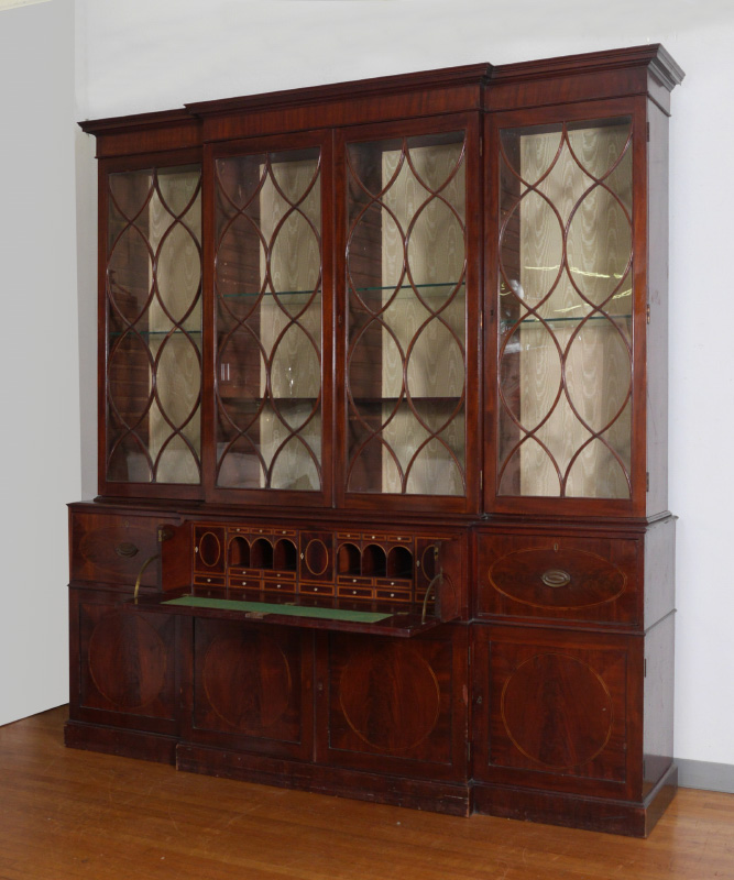 LARGE ENGLISH MAHOGANY BREAKFRONT CHINA CABINET: Top with 4 fretwork glass doors, stepped out center, glass and wood shelves, lights added to top at some point. Base with drop front secretary, internal doors, drawers, pigeon holes with shaped valences, string inlay, drawers on either side, over 4 doors with string inlay. 101 3/4'' h. x 93 1/2'' x 22 1/4''.